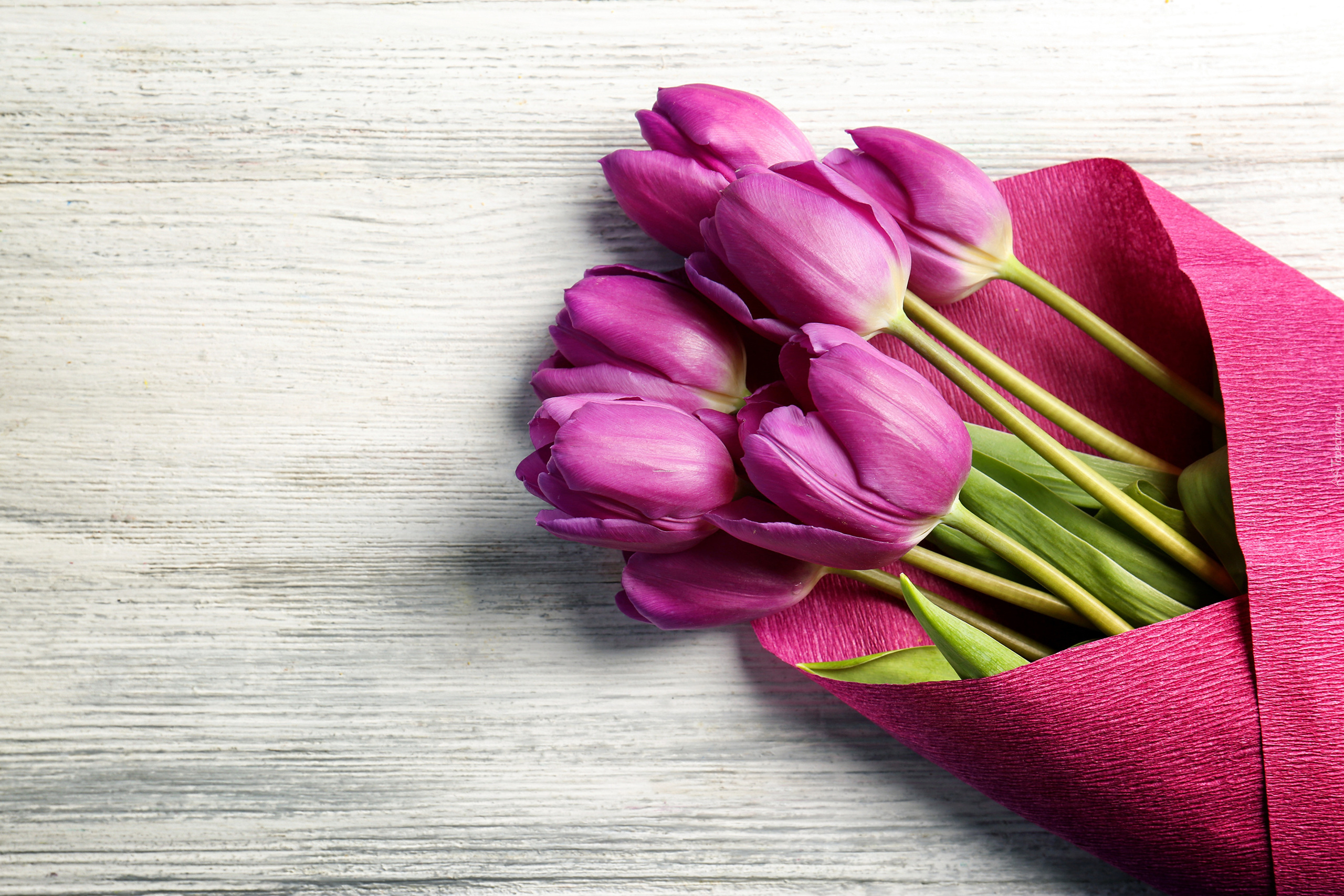 Edytor tapety: Fioletowe tulipany w bibule na deskach