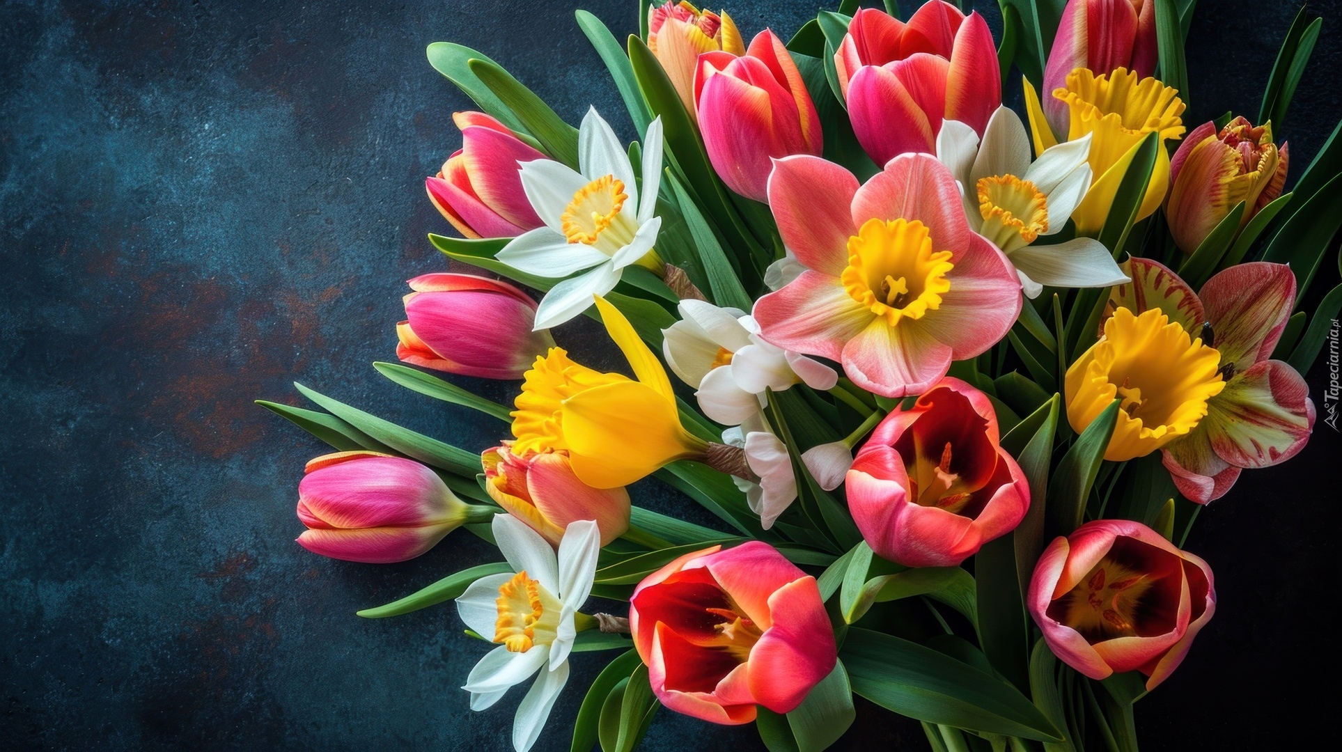 Edytor tapety: Rozświetlony bukiet kolorowych kwiatów na ciemnym tle