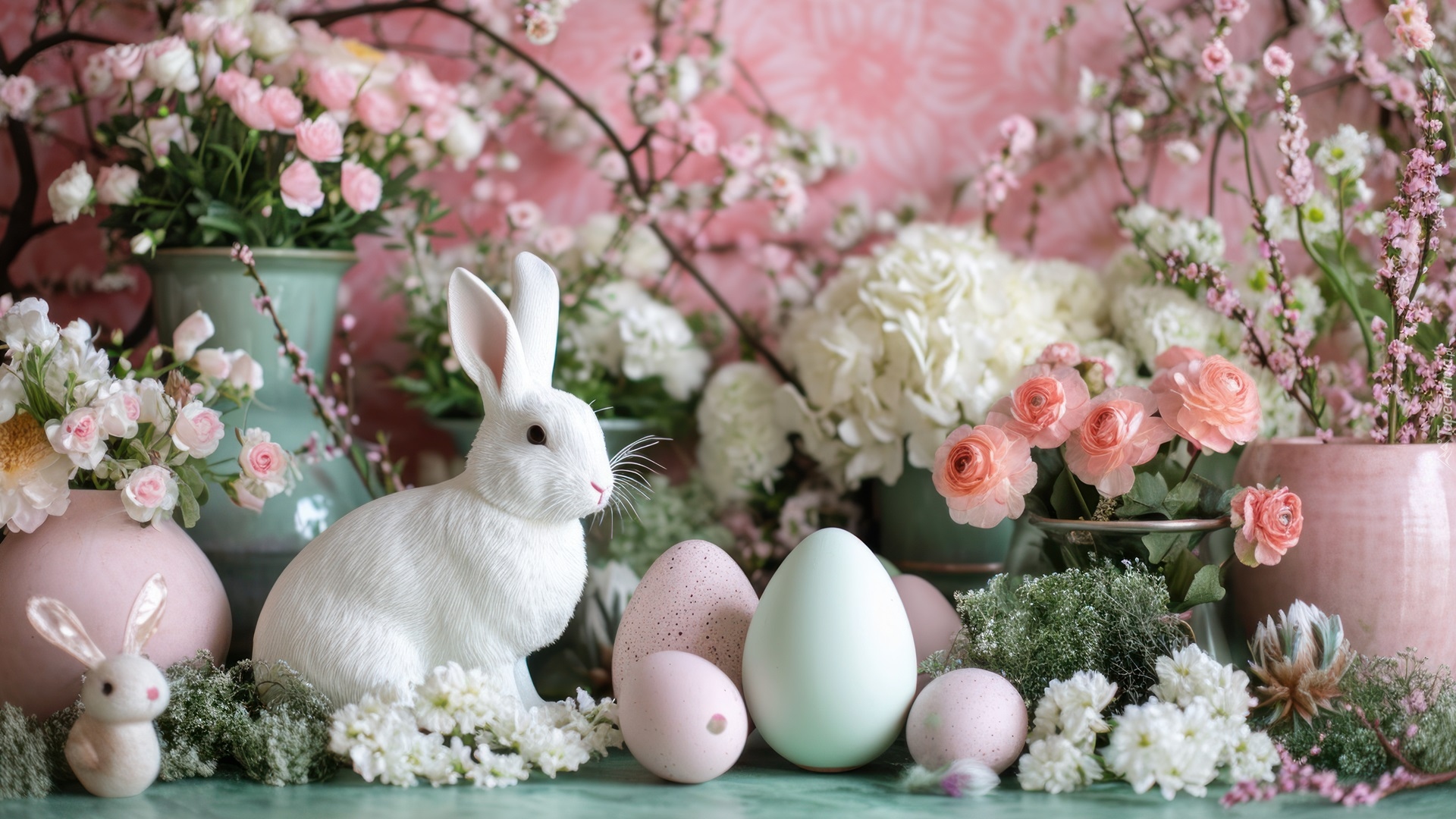 Edytor tapety: Figurka zajączka i pisanki otoczone kwiatami