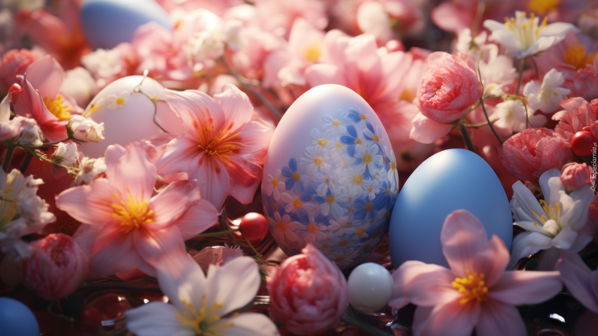 Edytor tapety: Pisanki i różowe kwiatki w zbliżeniu