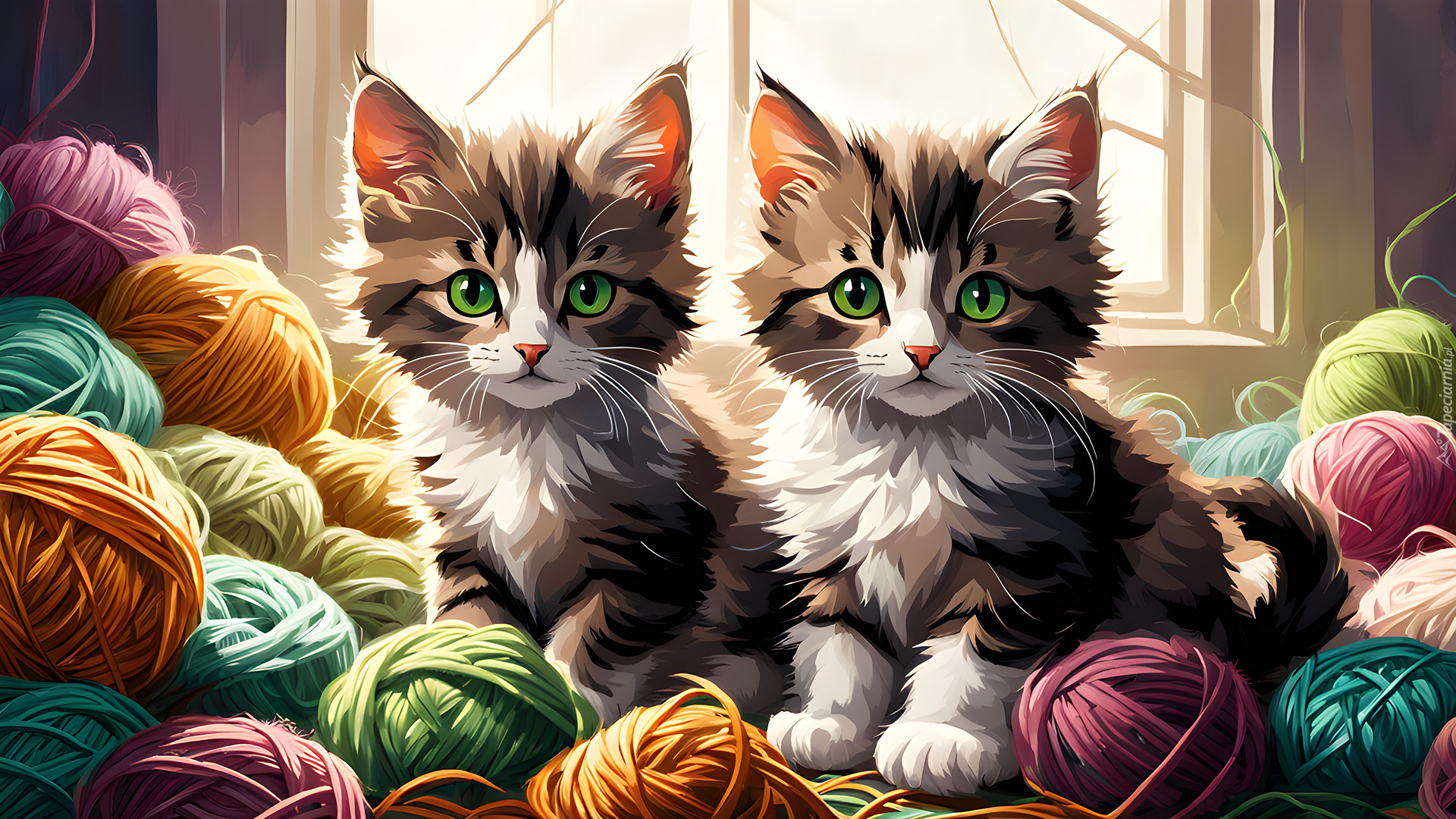 Edytor tapety: Kolorowe kłębki włóczki i kotki