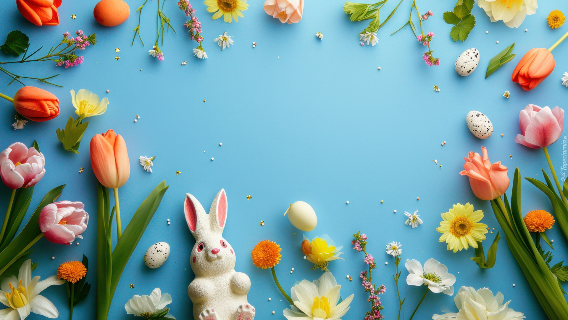 Edytor tapety: Figurka zajączka i kolorowe kwiatki na niebieskim tle