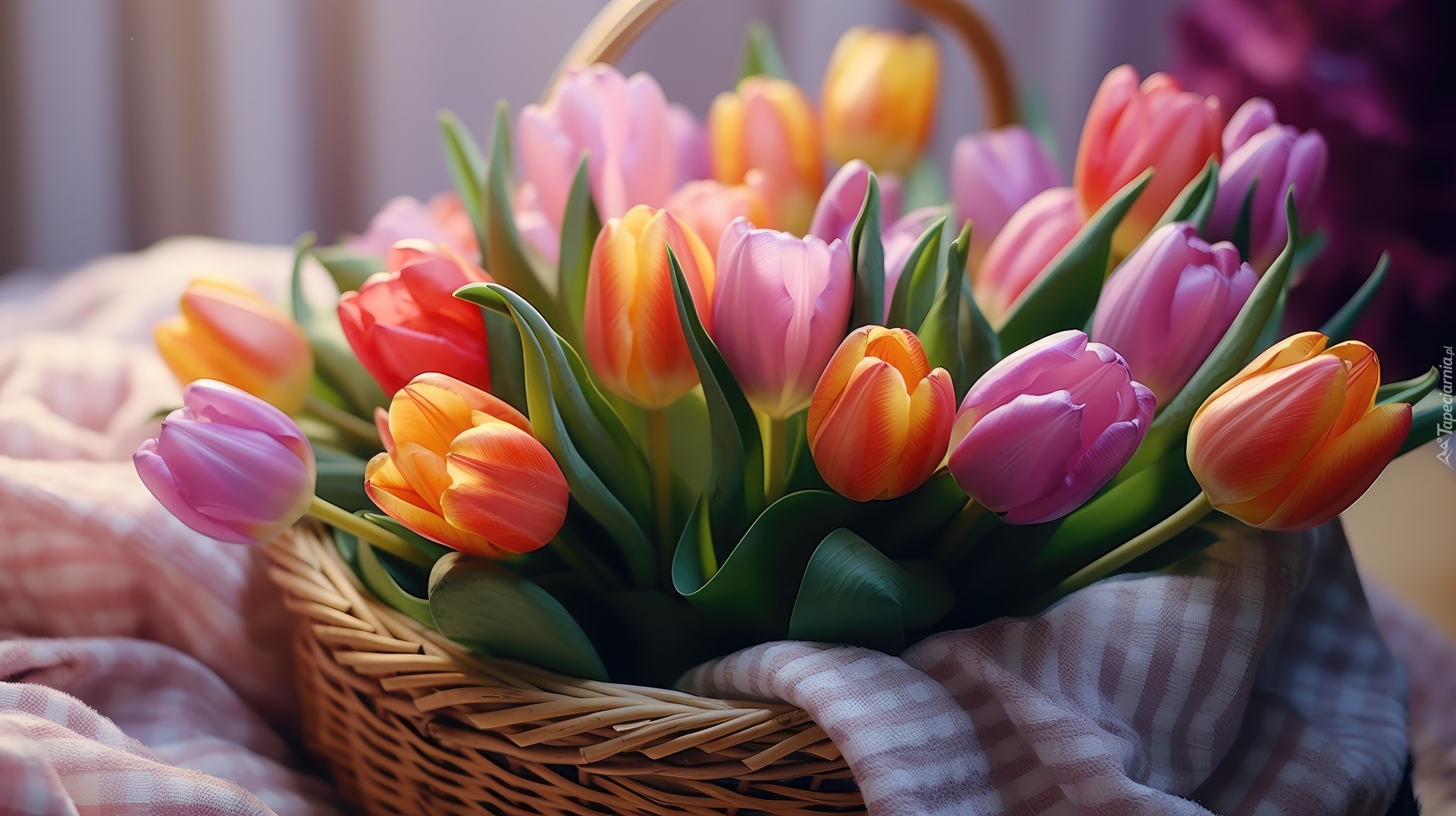 Edytor tapety: Rozświetlone kolorowe tulipany z materiałem w koszyku