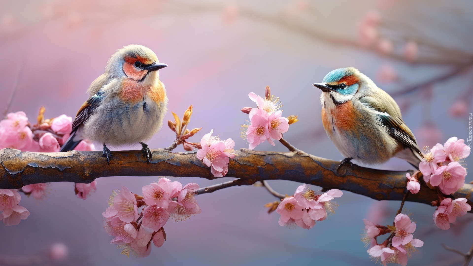 Edytor tapety: Dwa kolorowe ptaki na ukwieconej gałązce