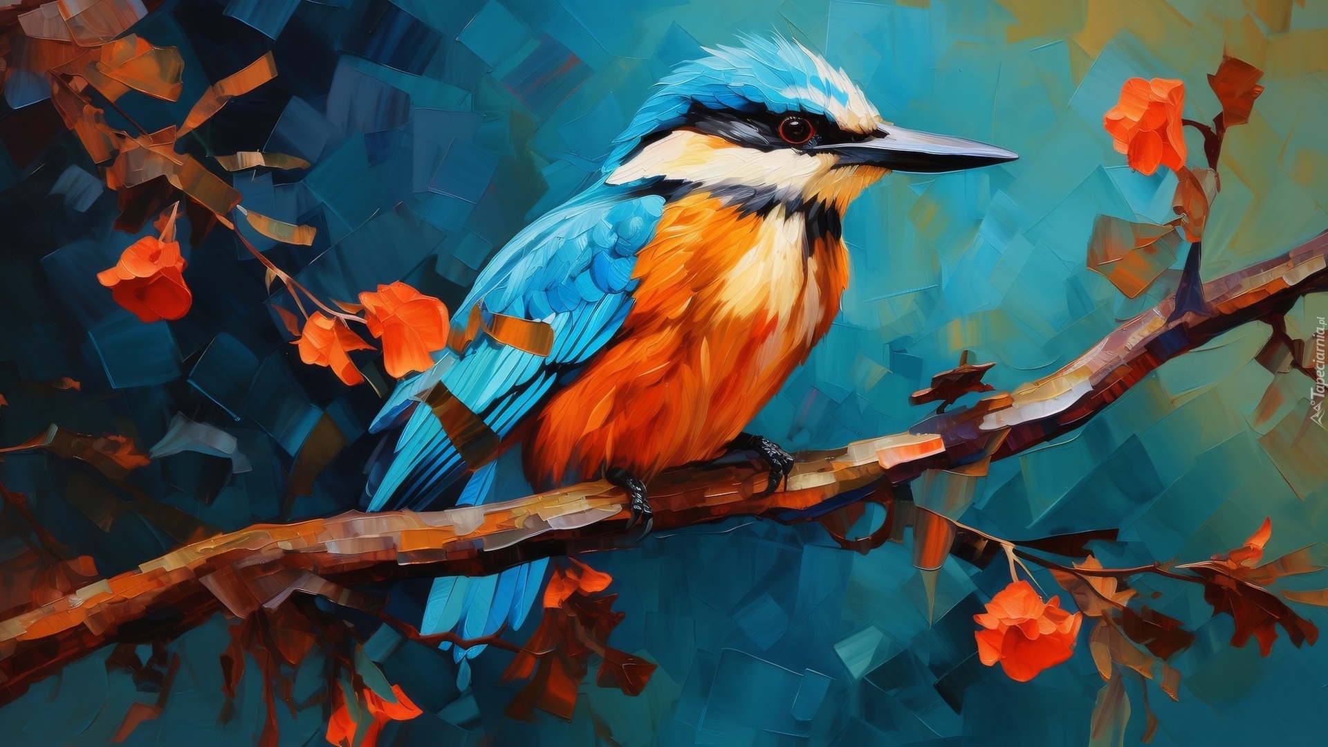 Edytor tapety: Zimorodek na ukwieconej gałązce w grafice