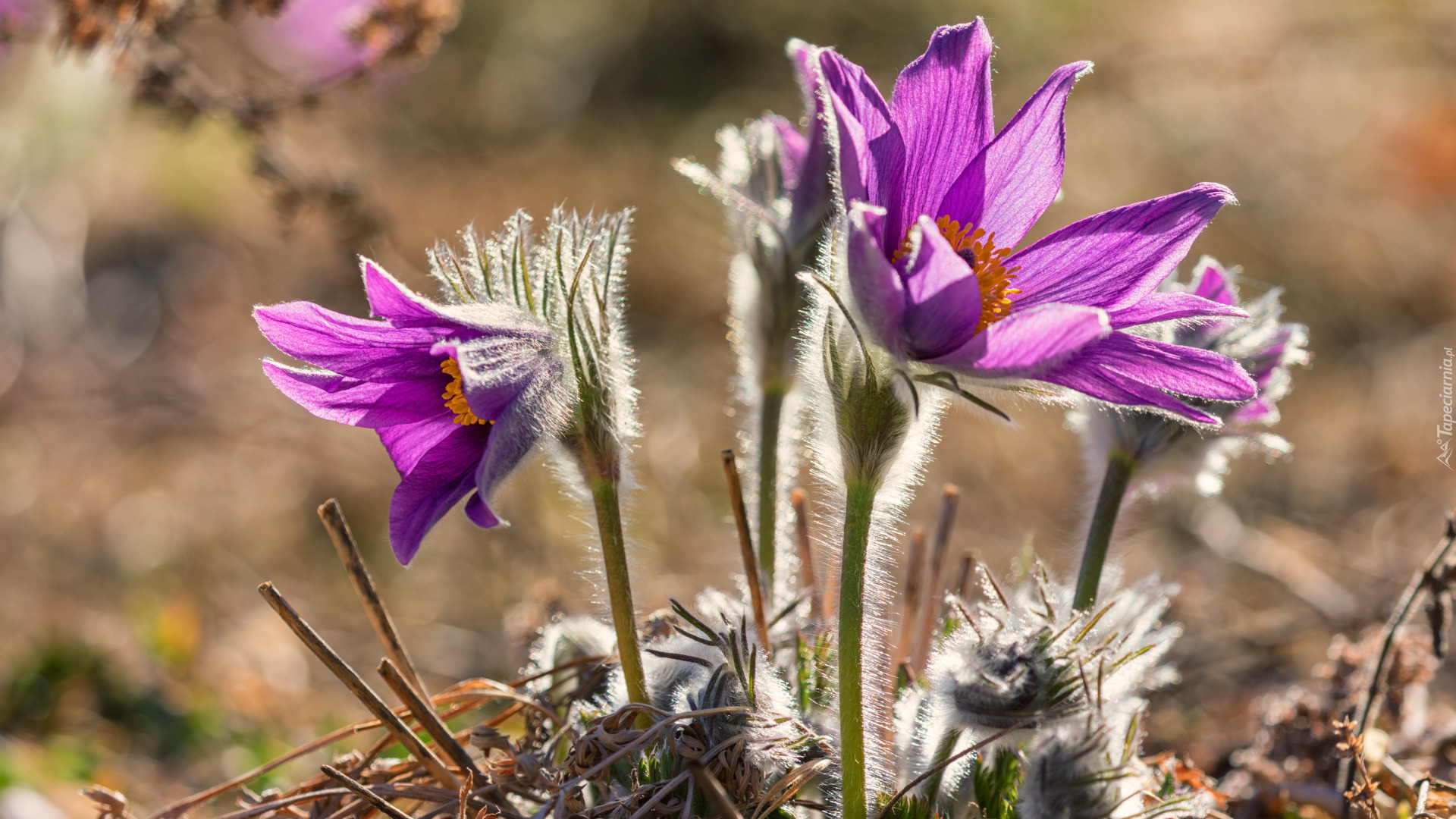 Edytor tapety: Rozświetlone blaskiem słońca fioletowe sasanki