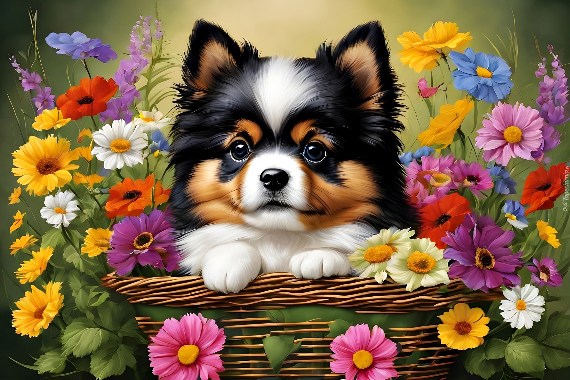 Edytor tapety: Szczeniak w koszyku otoczonym kwiatami