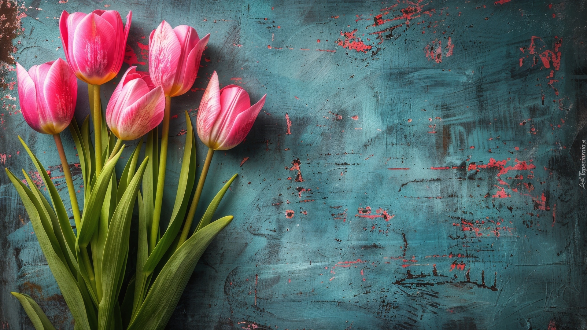 Edytor tapety: Pięć różowych tulipanów na tle zniszczonej powierzchni