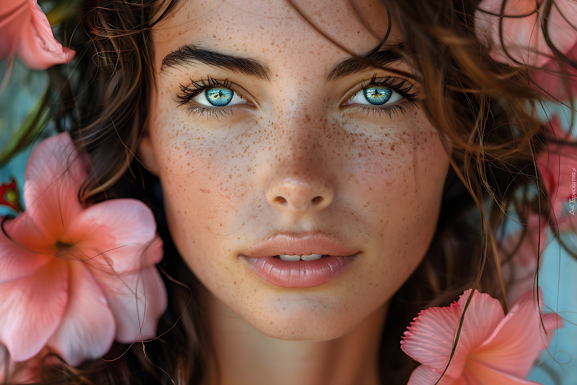 Edytor tapety: Twarz piegowatej dziewczyny z kwiatami we włosach