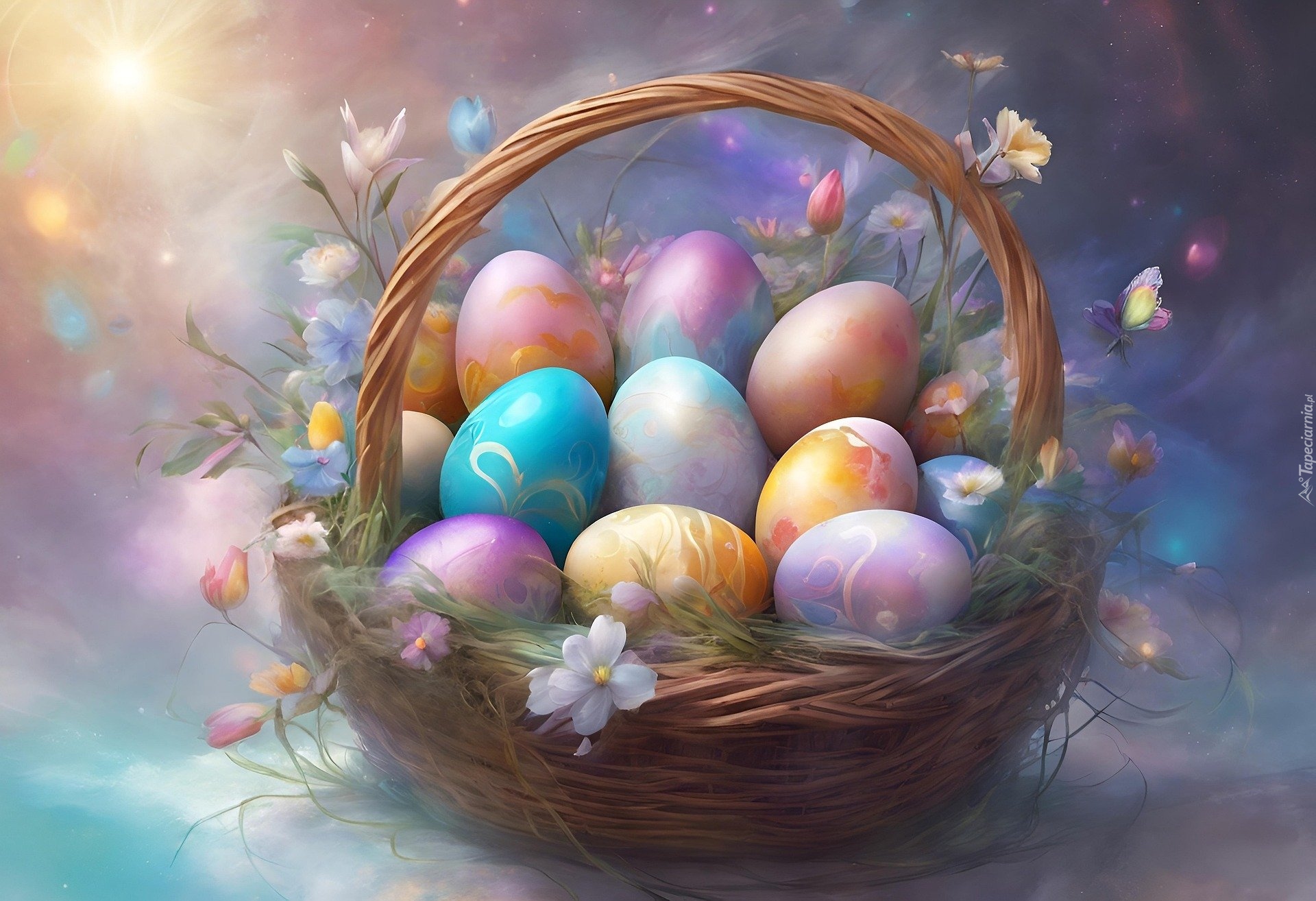 Edytor tapety: Pisanki i kwiaty w koszyczku na kolorowym tle