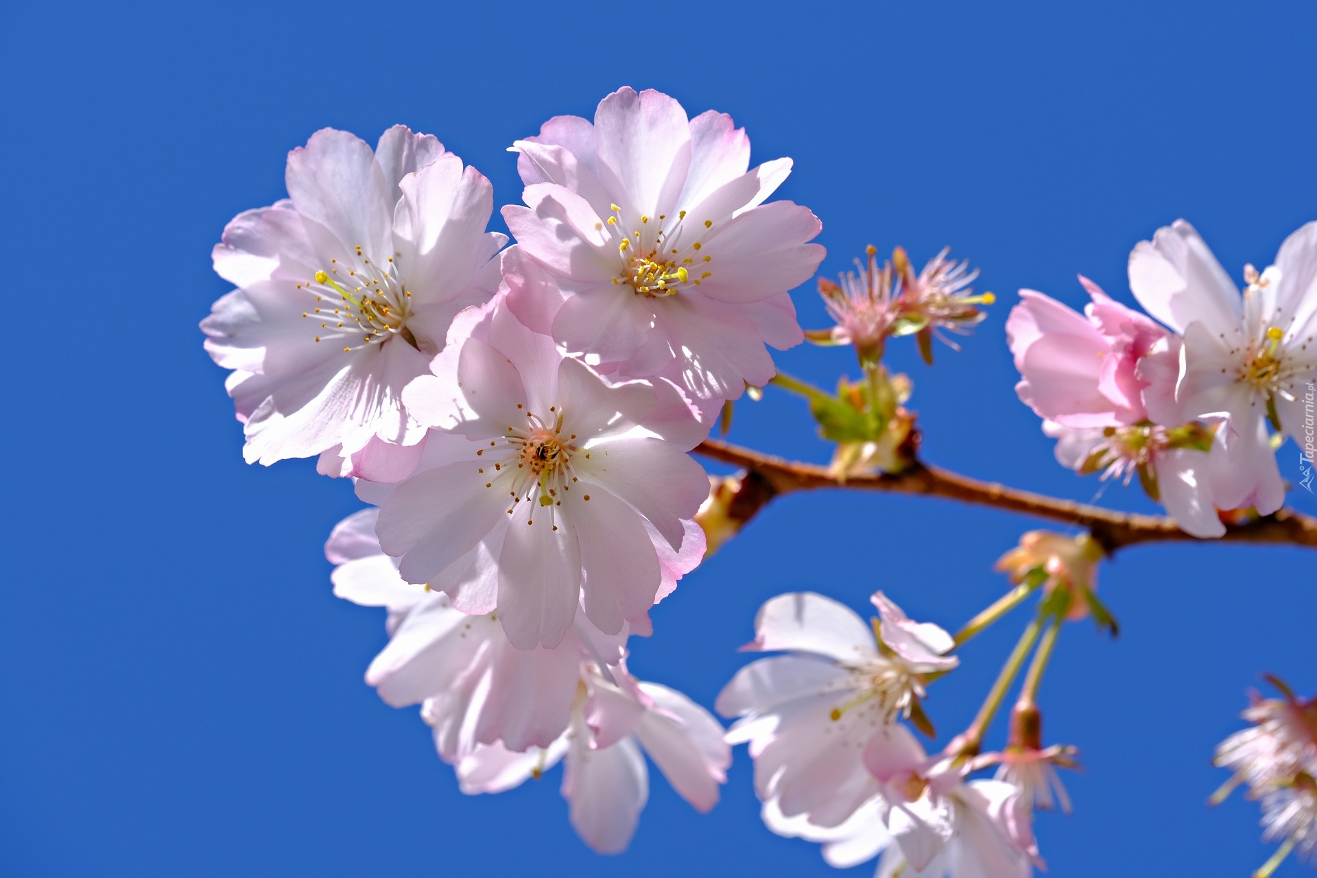 Edytor tapety: Rozświetlona ukwiecona gałązka na niebieskim tle