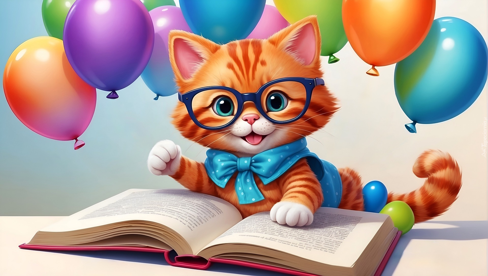 Edytor tapety: Kotek nad książką i kolorowe balony