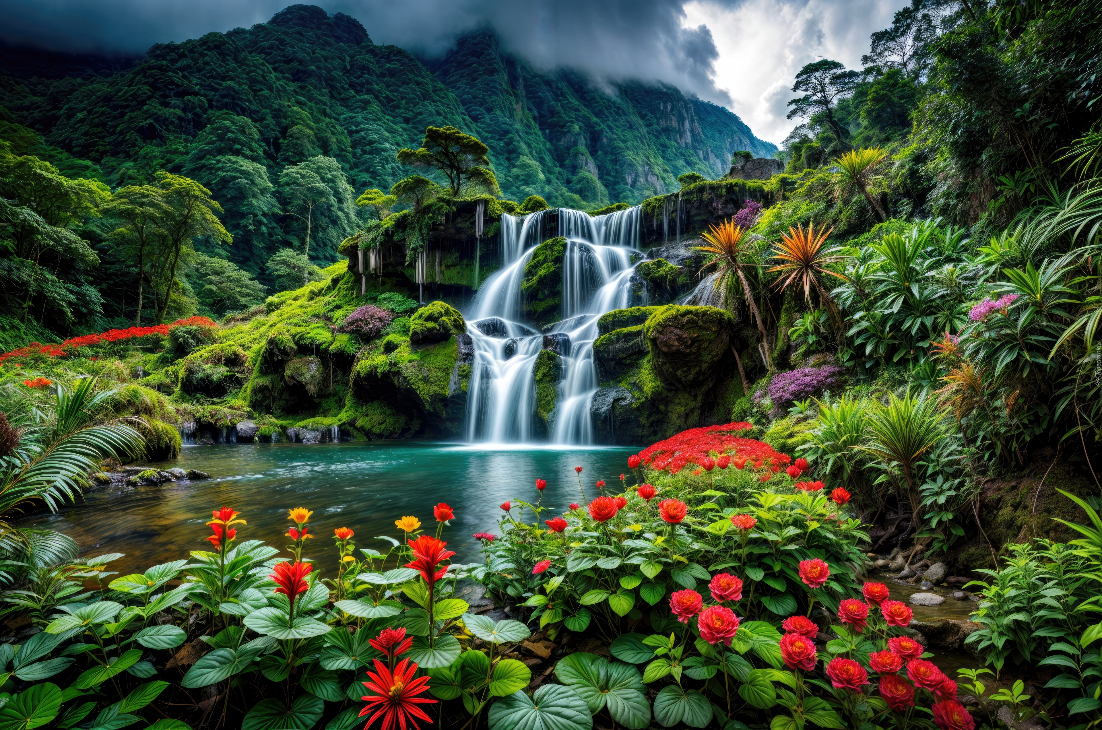 Edytor tapety: Rośliny przy wodospadzie na omszonej skale w górach