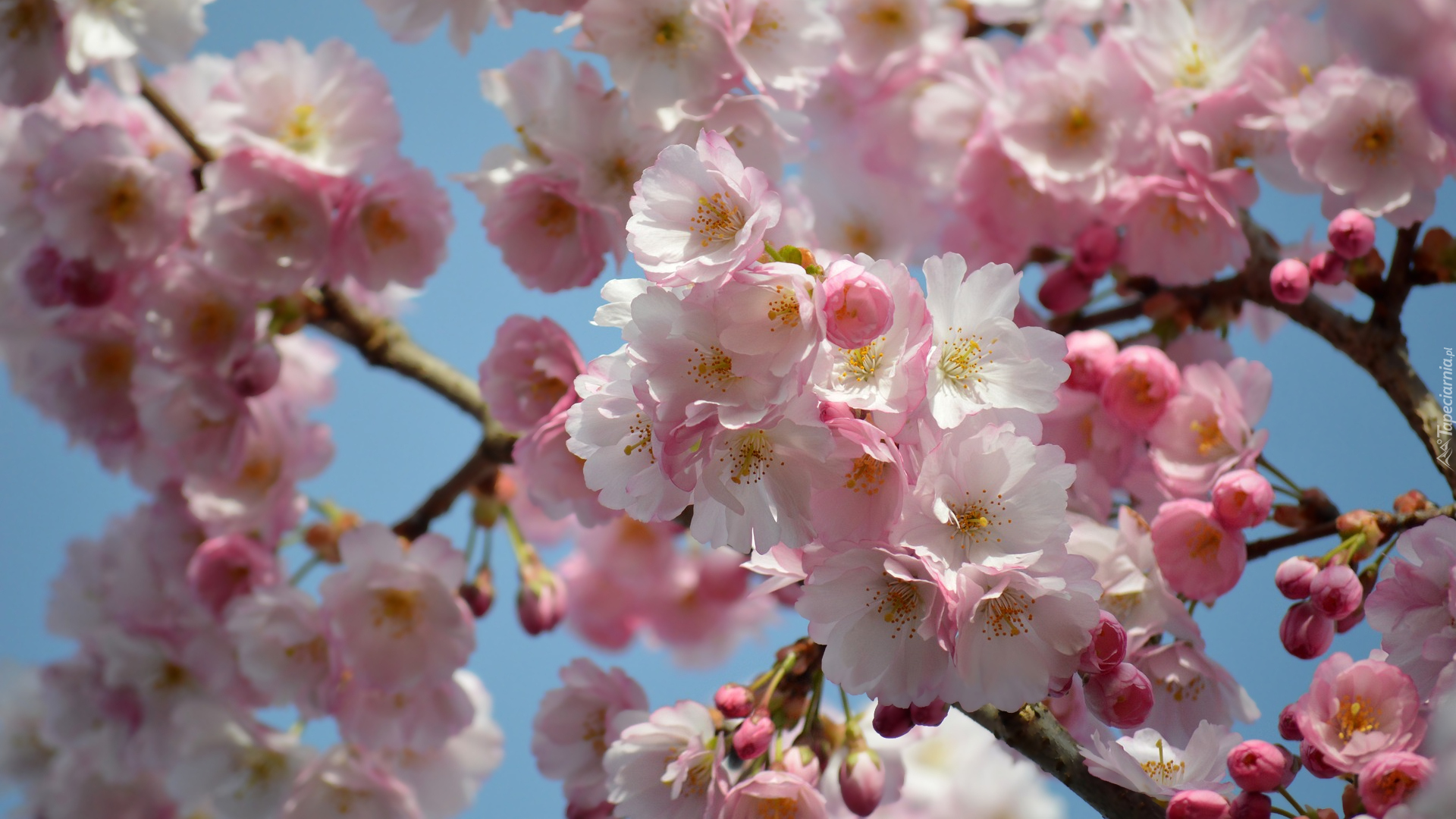 Edytor tapety: Rozświetlone gałązki z białymi i różowymi kwiatkami