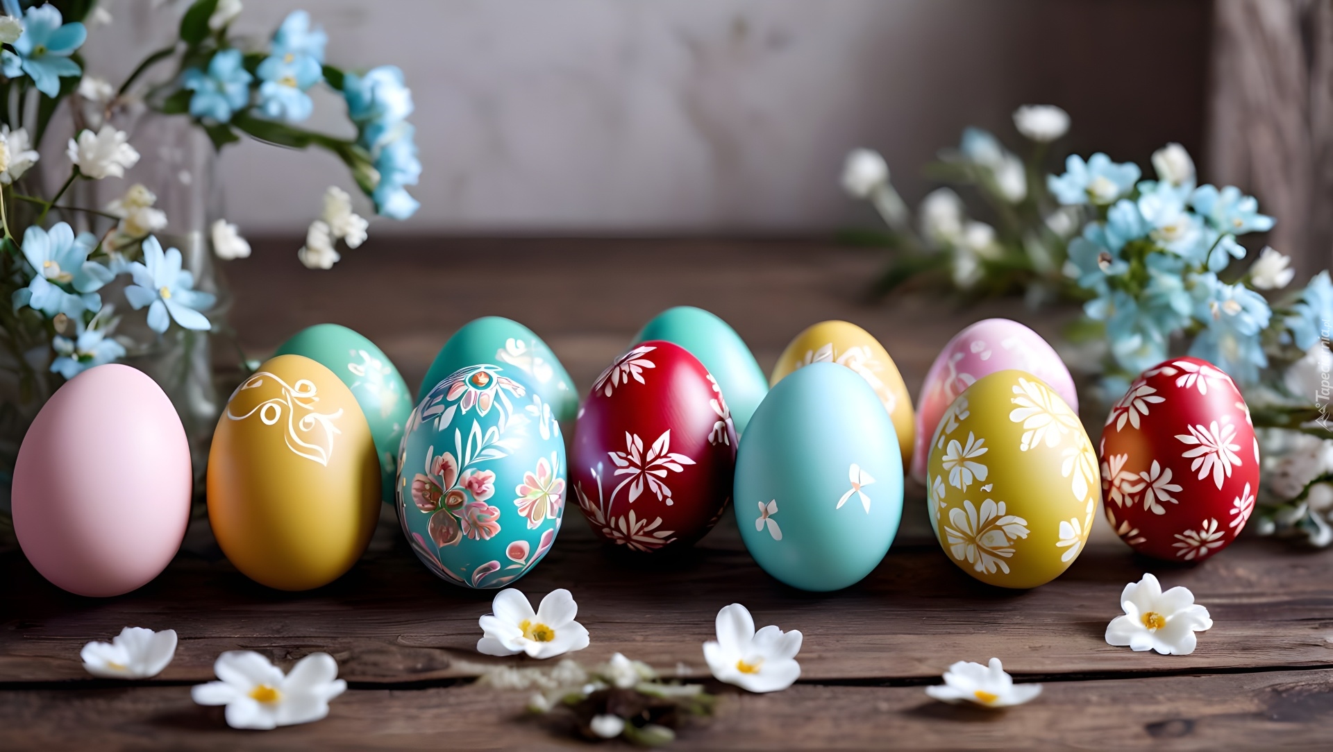 Edytor tapety: Pisanki i drobne niebieskie kwiatki na deskach