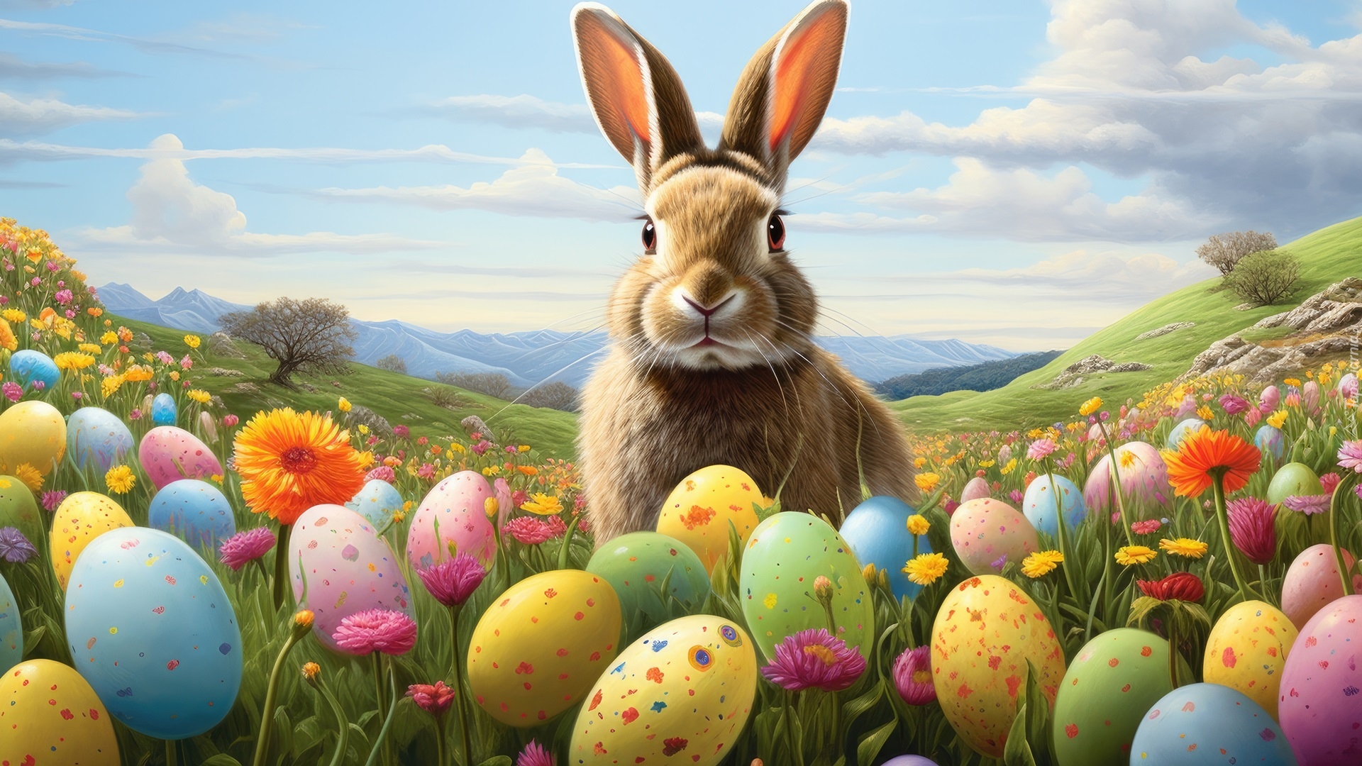 Edytor tapety: Królik na kwiatowej łące z pisankami