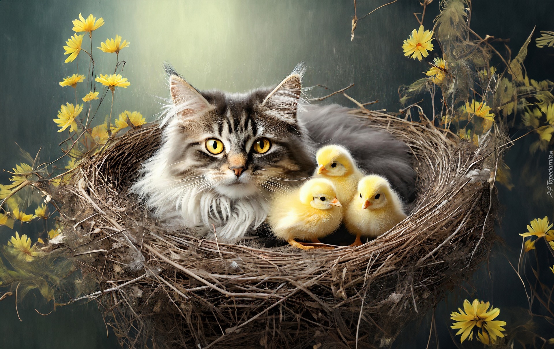 Edytor tapety: Kot i trzy kurczaki w gniazdku otoczonym kwiatami