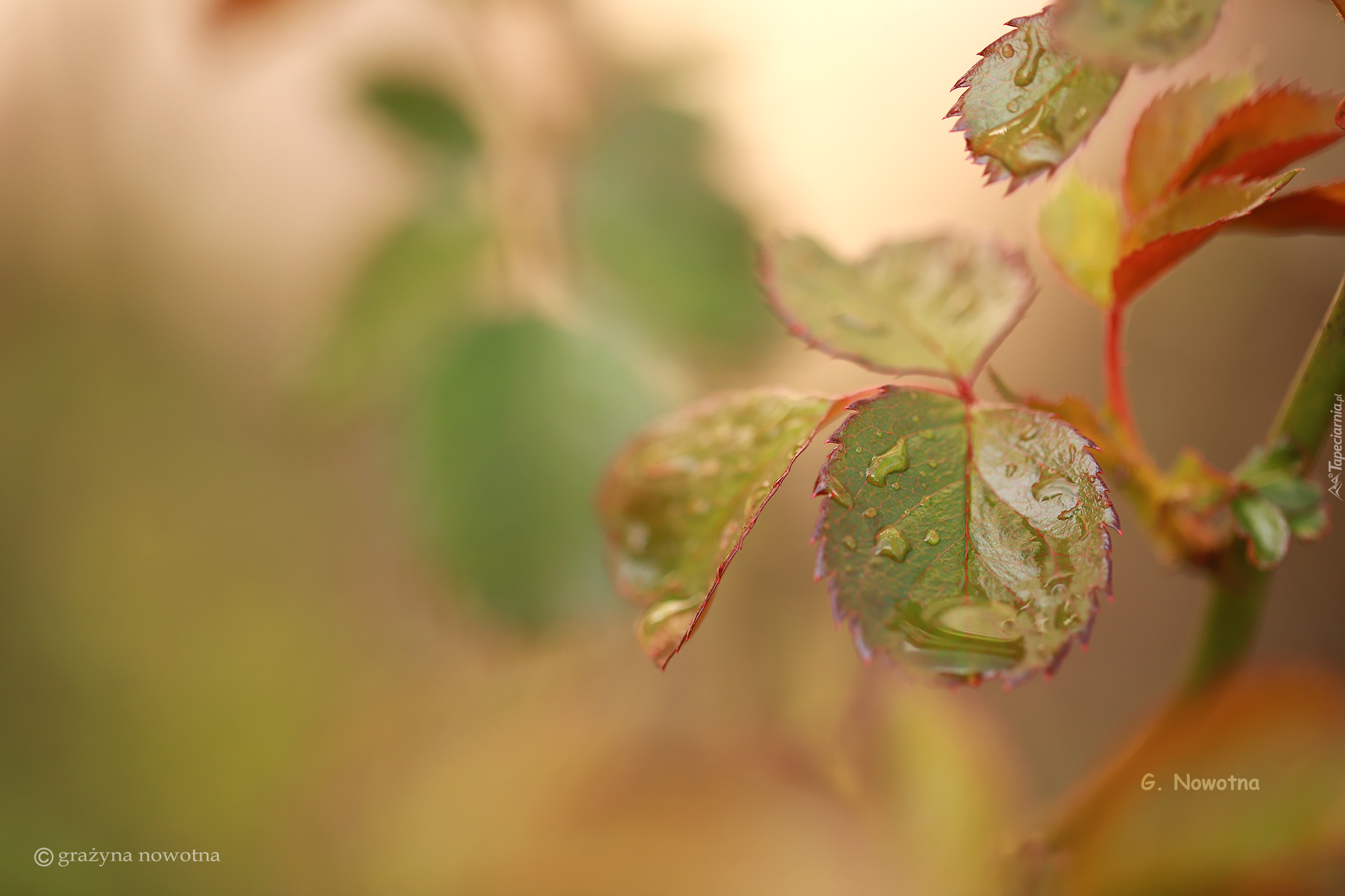 Edytor tapety: Liście z kroplami wody na rozmytym tle