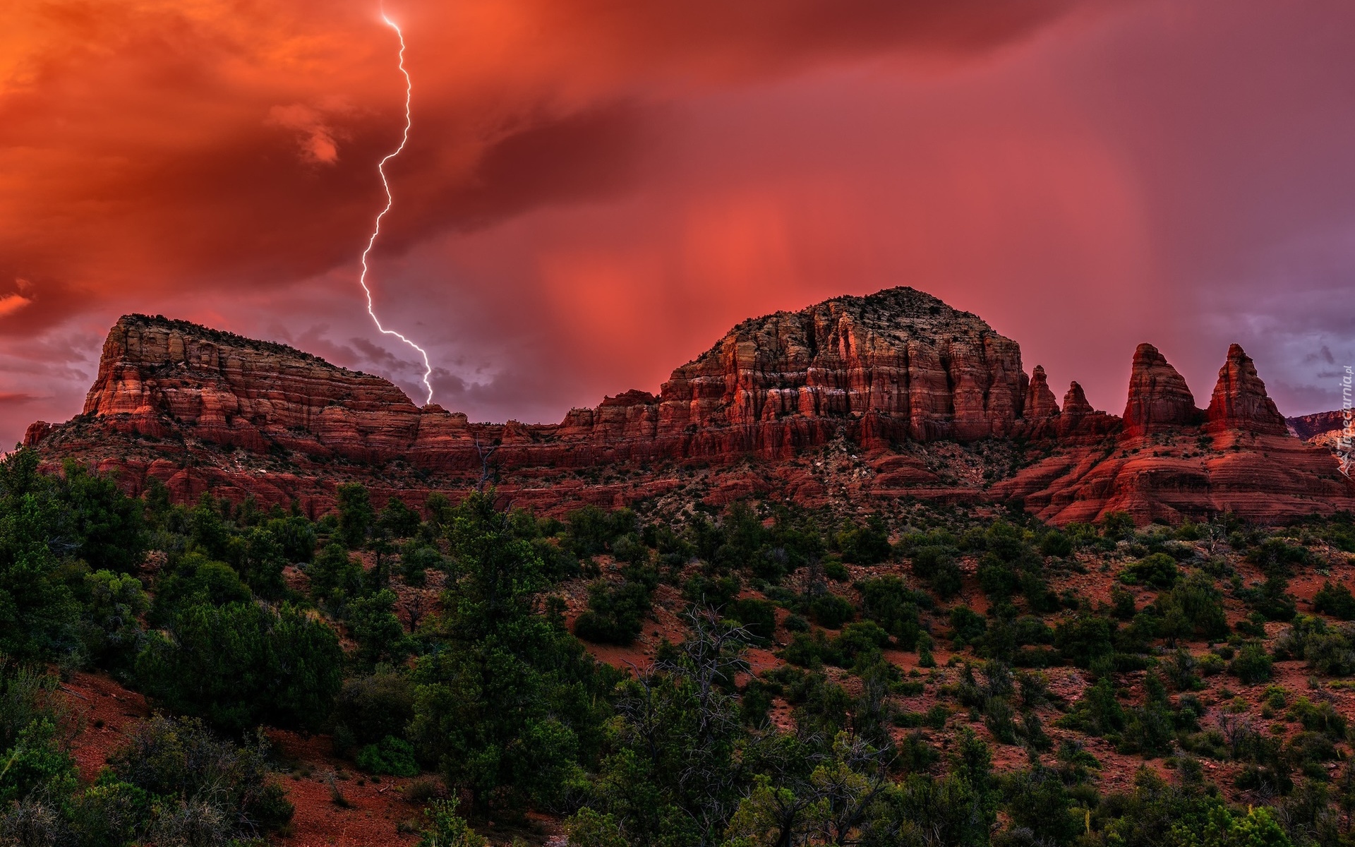 Edytor tapety: Błyskawica na czerwonym niebie nad skałami w Sedonie