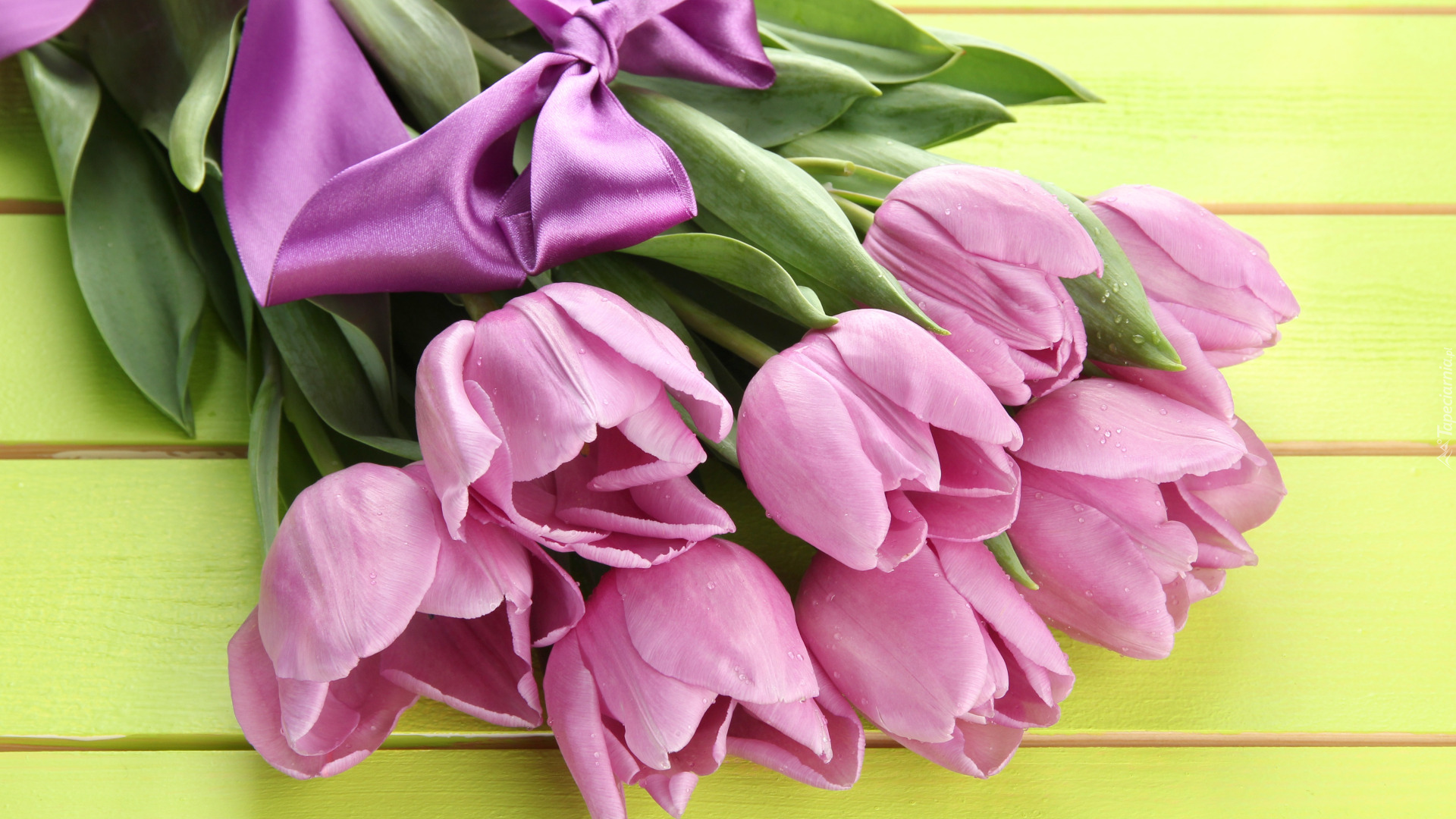 Edytor tapety: Różowe tulipany z fioletową kokardą