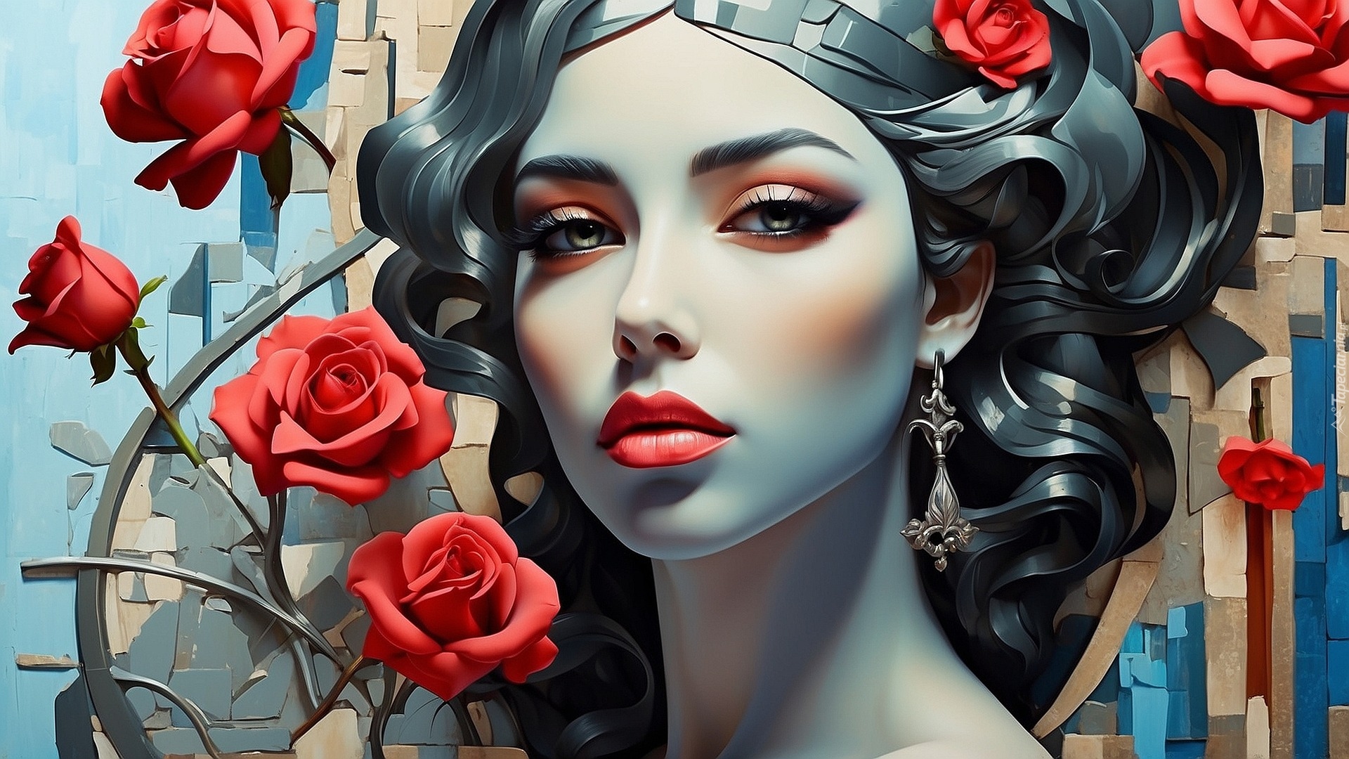 Edytor tapety: Czerwone róże i twarz czarnowłosej kobiety