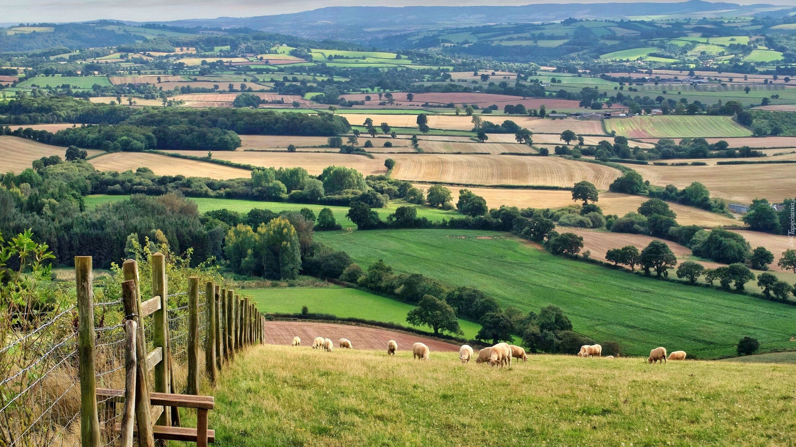 Edytor tapety: Owce na ogrodzonym pastwisku z widokiem na pola
