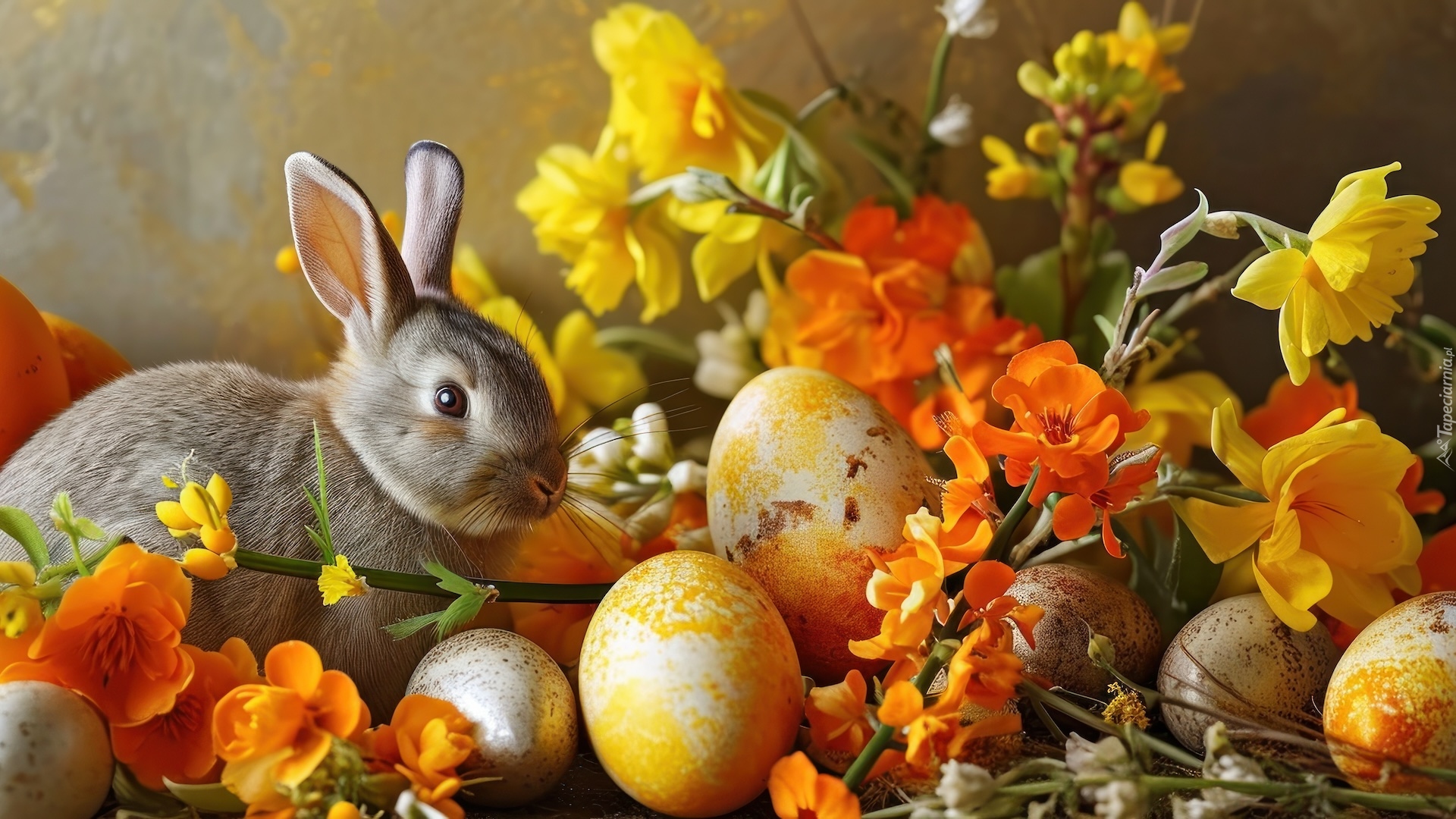 Edytor tapety: Królik otoczony pisankami i kwiatami