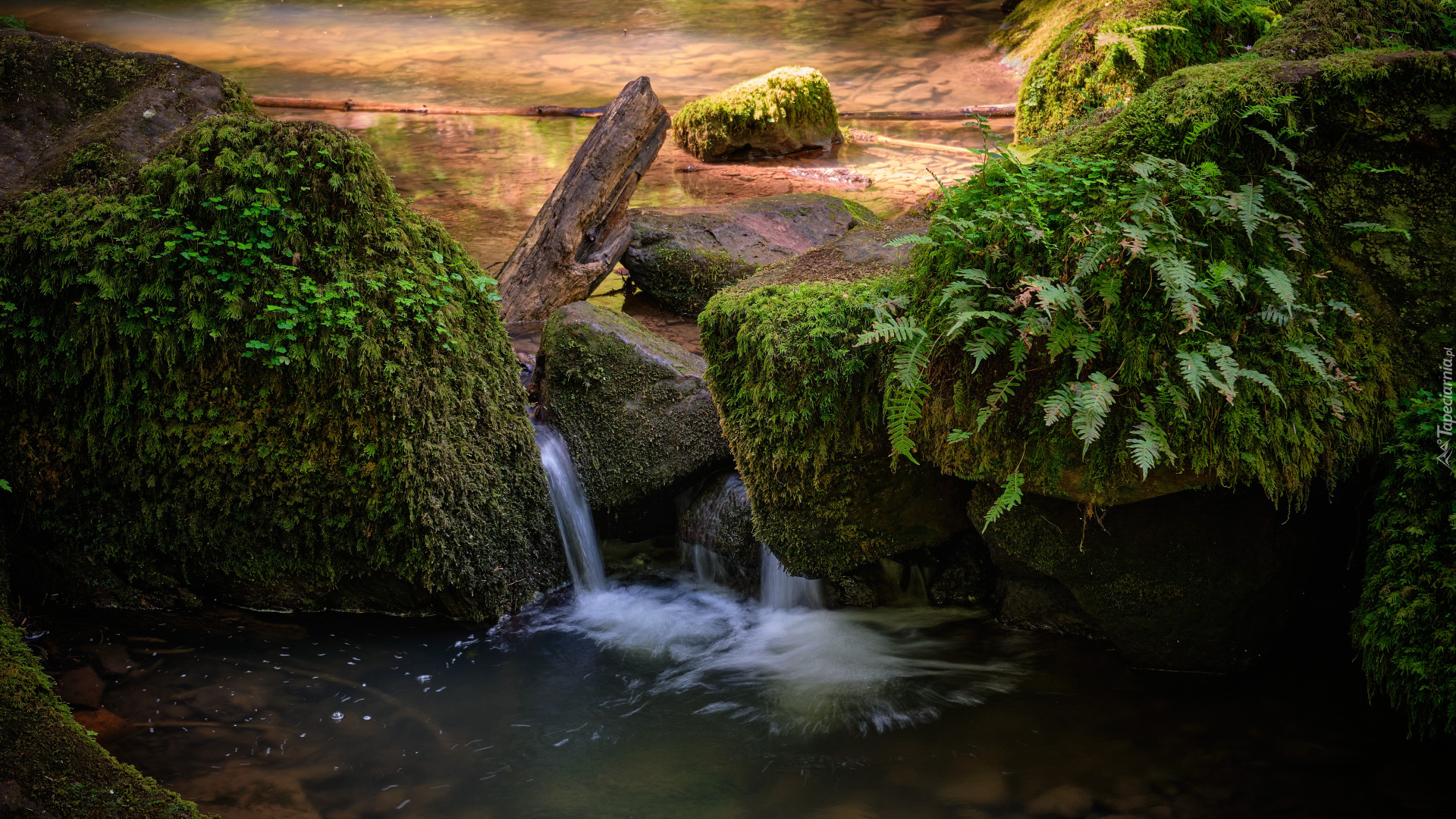 Edytor tapety: Paprocie na omszałych skałach nad wodą