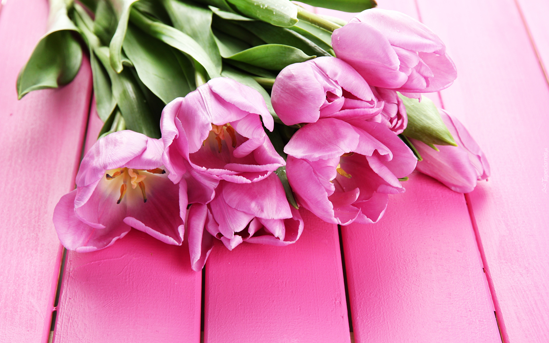 Edytor tapety: Bukiet różowych tulipanów na różowych deskach