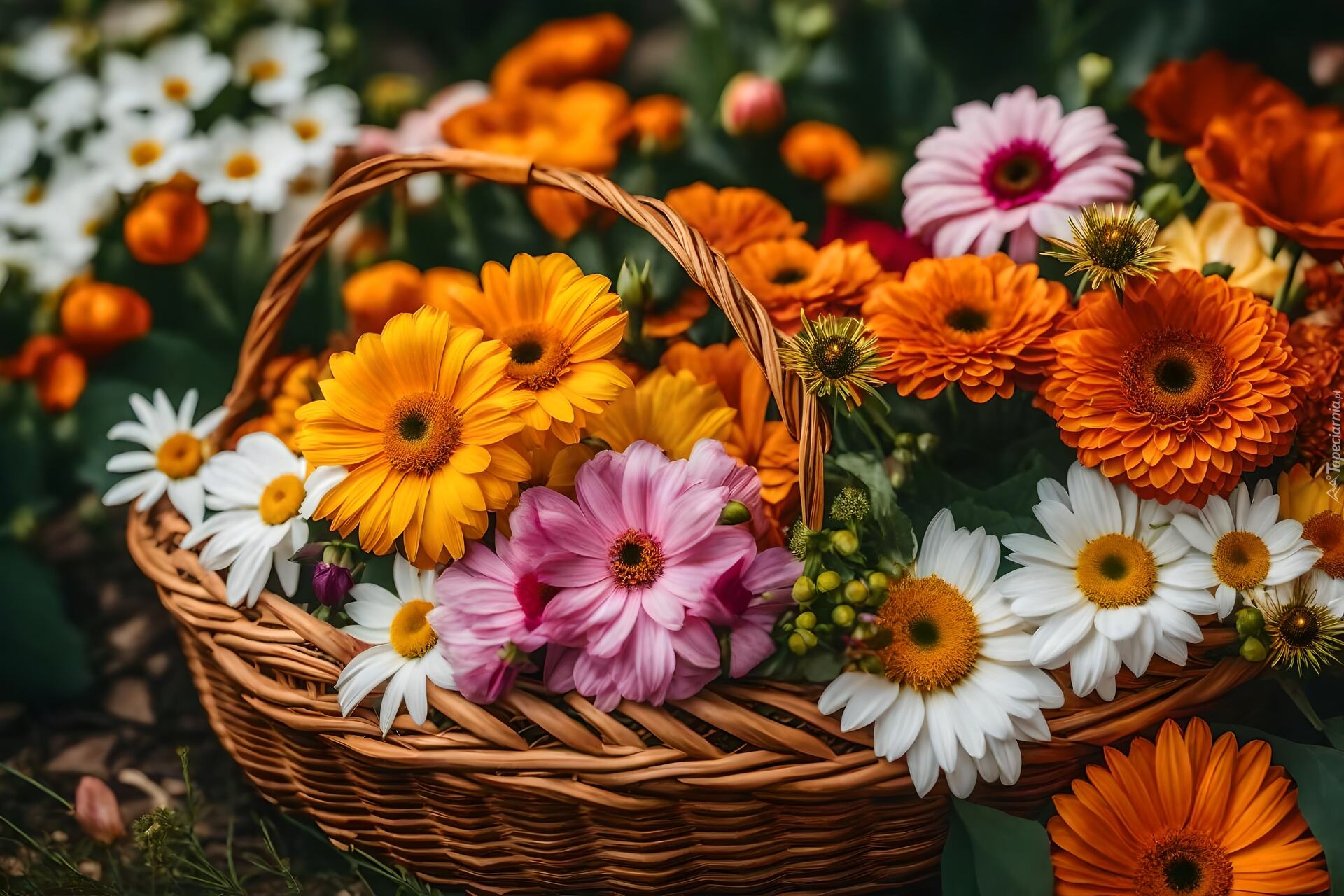 Edytor tapety: Różnokolorowe kwiaty w wiklinowym koszyku