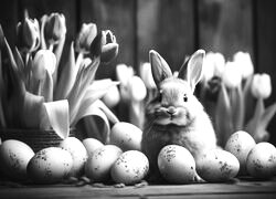 Edytor tapety: Pisanki wokół zająca i kolorowe tulipany