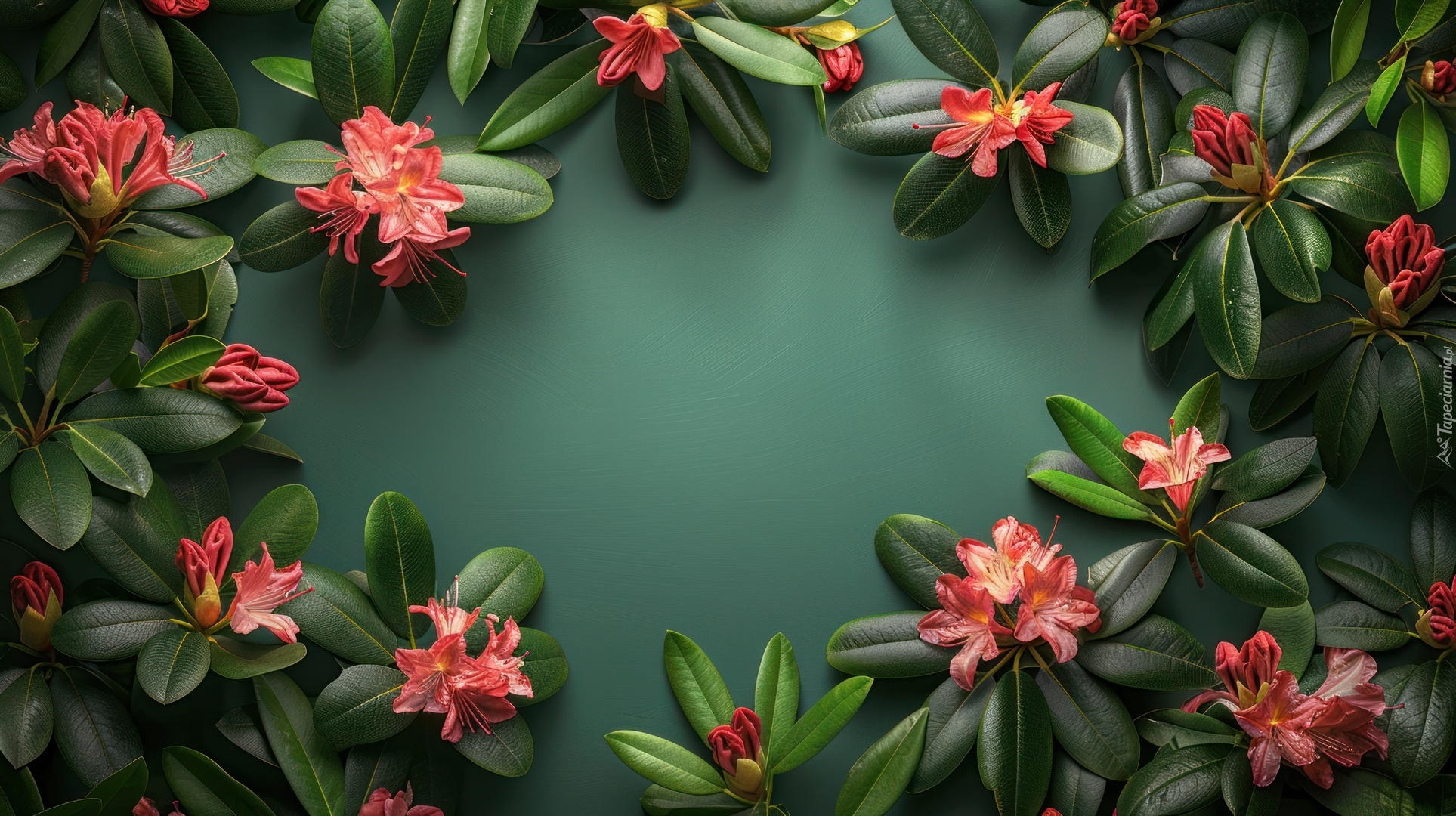 Edytor tapety: Różowe kwiaty różanecznika z liśćmi na zielonym tle