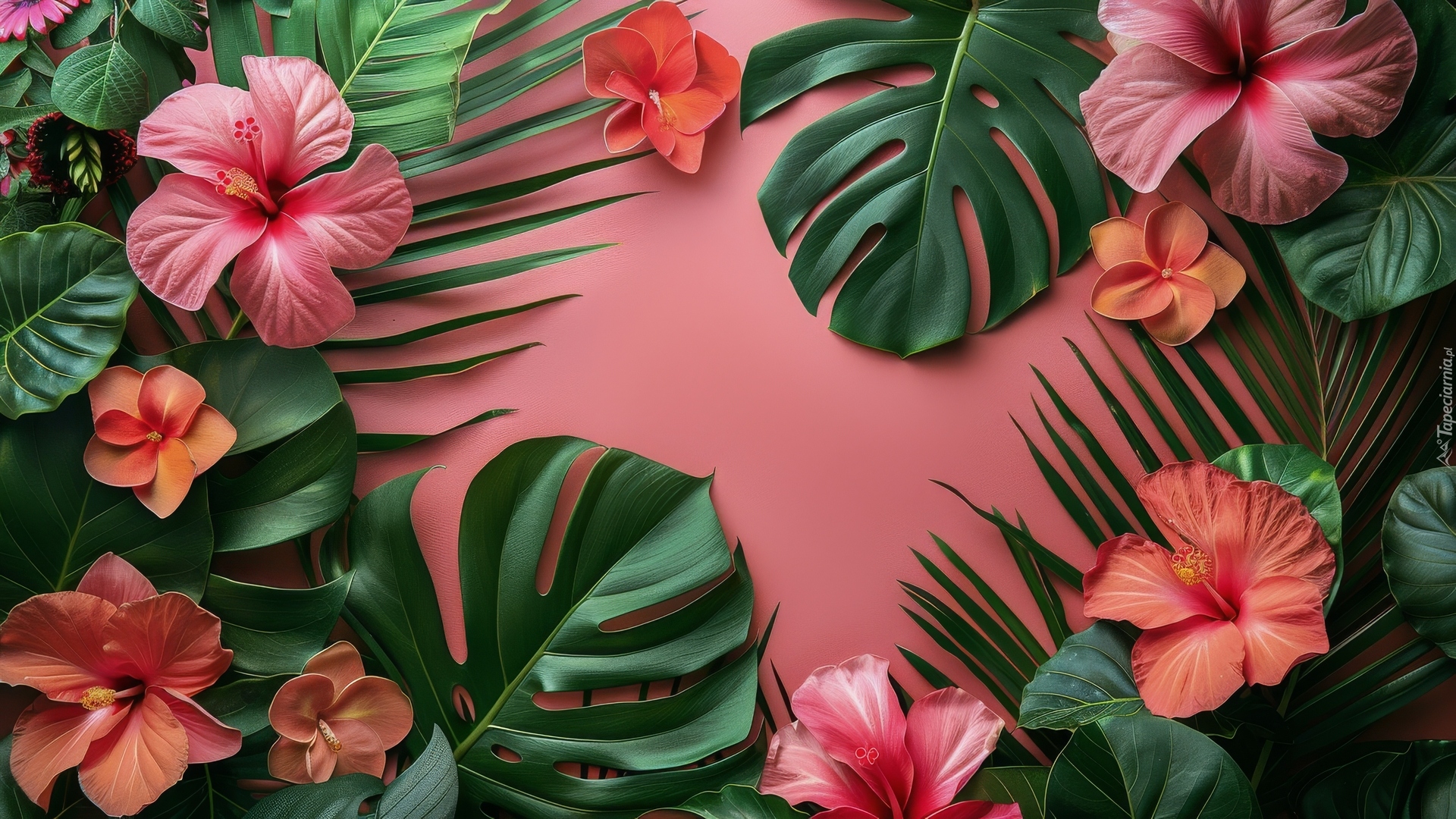 Edytor tapety: Dwukolorowe hibiskusy na liściach