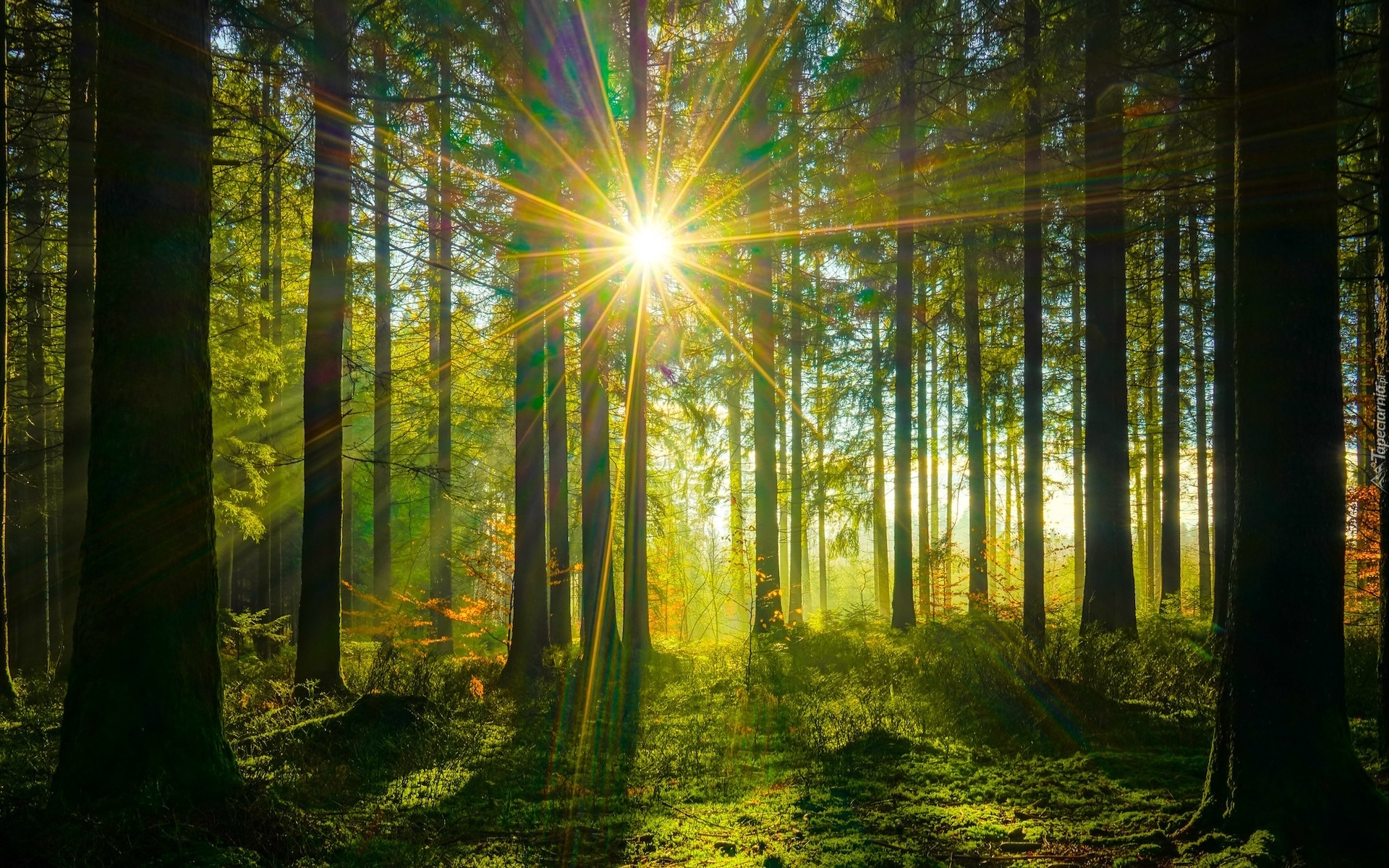Edytor tapety: Rozświetlony promieniami słońca las