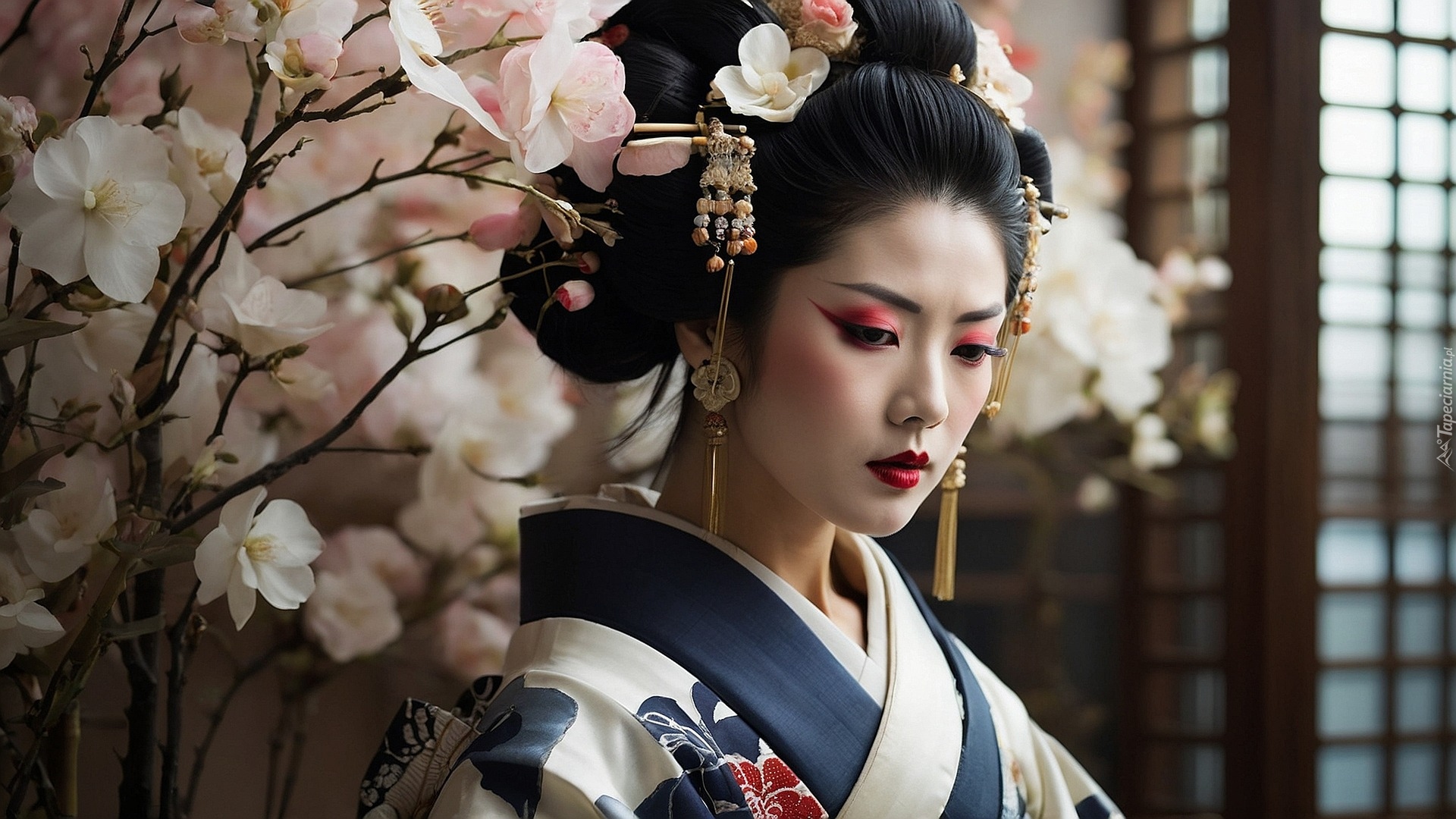 Edytor tapety: Gejsza w kimonie obok kwiatów magnolii