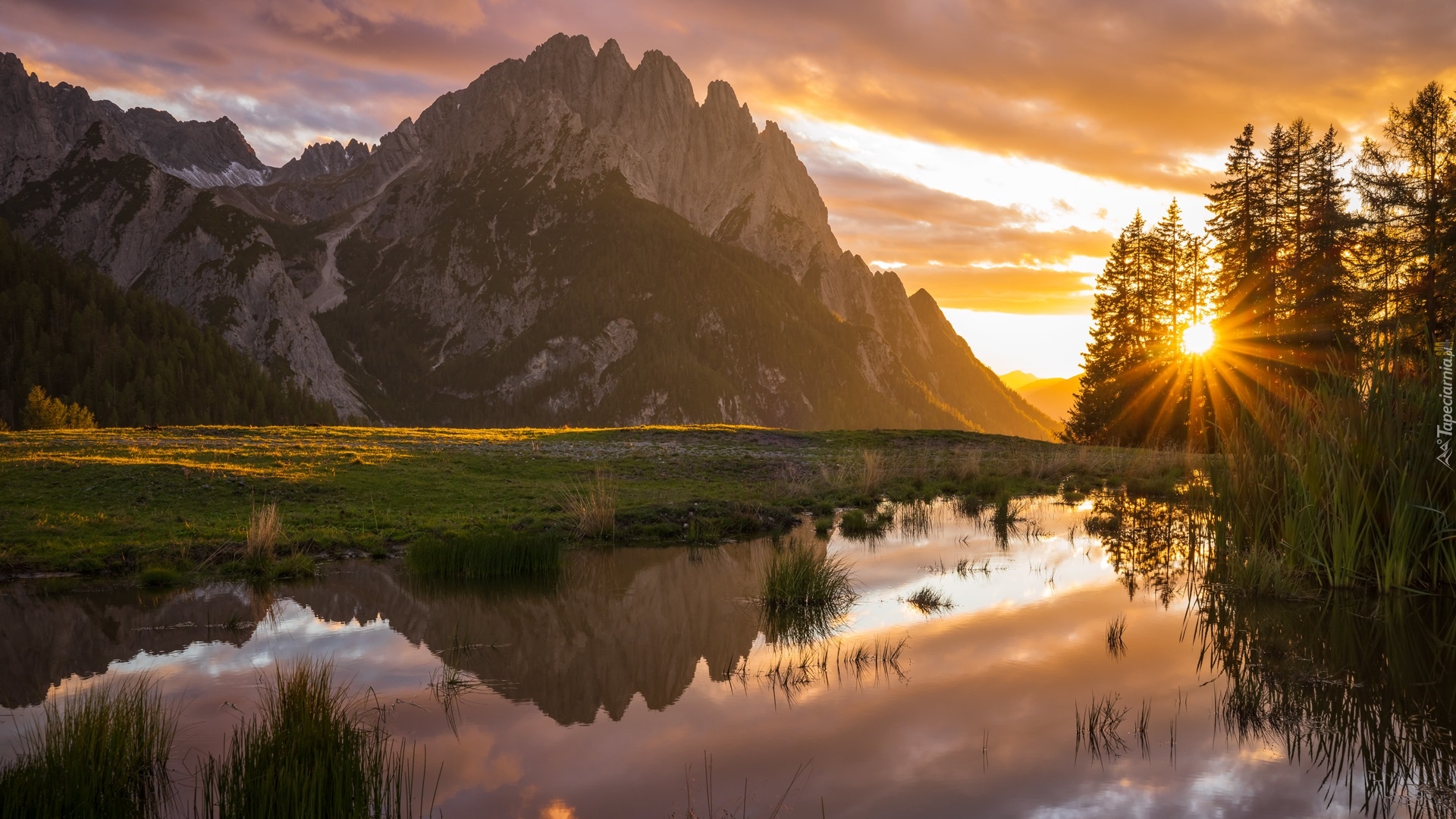 Edytor tapety: Górskie jezioro i drzewa w promieniach wschodzącego słońca