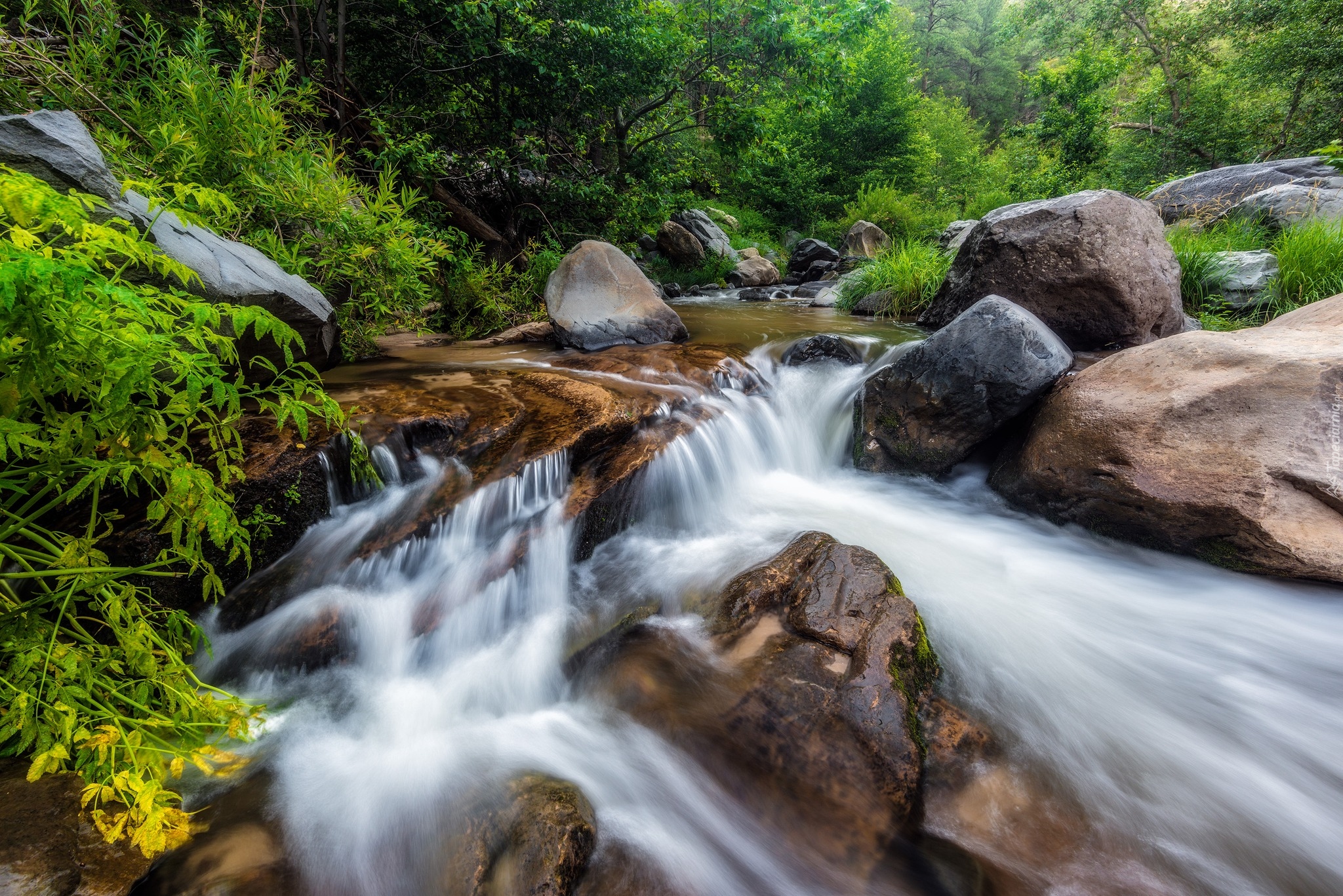 Edytor tapety: Drzewa obok głazów i kamieni na rwącej rzece
