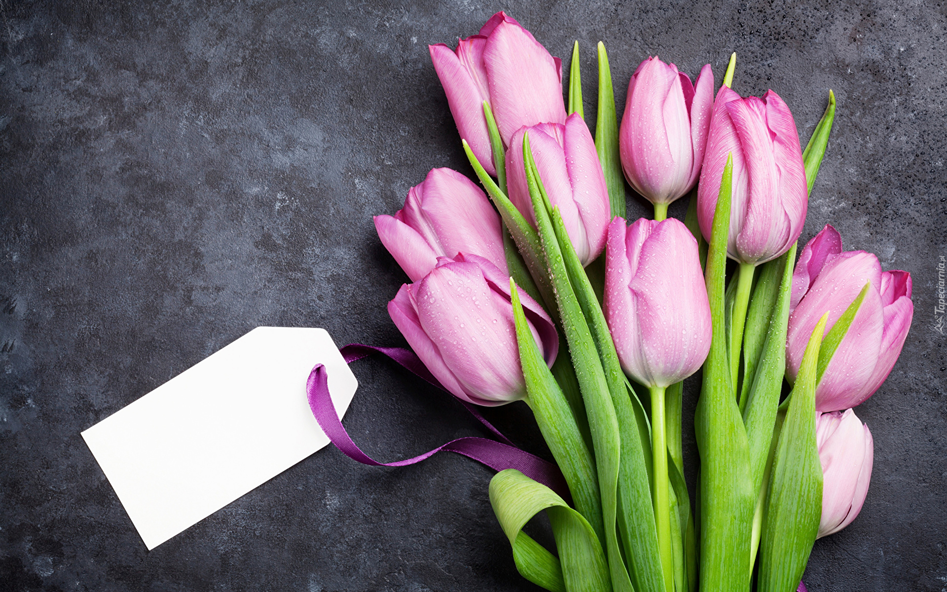 Edytor tapety: Zroszone różowe tulipany z zawieszką