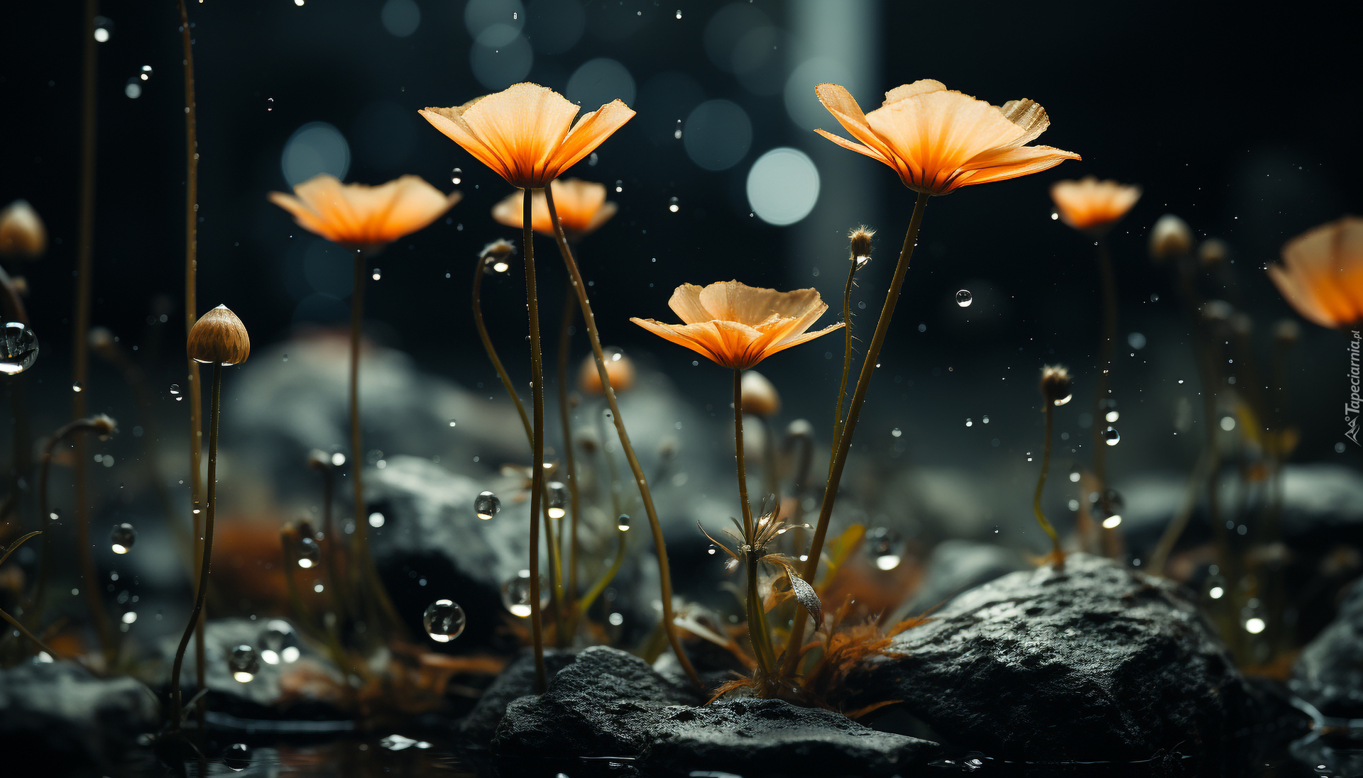 Edytor tapety: Pomarańczowe kwiatuszki i spadające krople wody