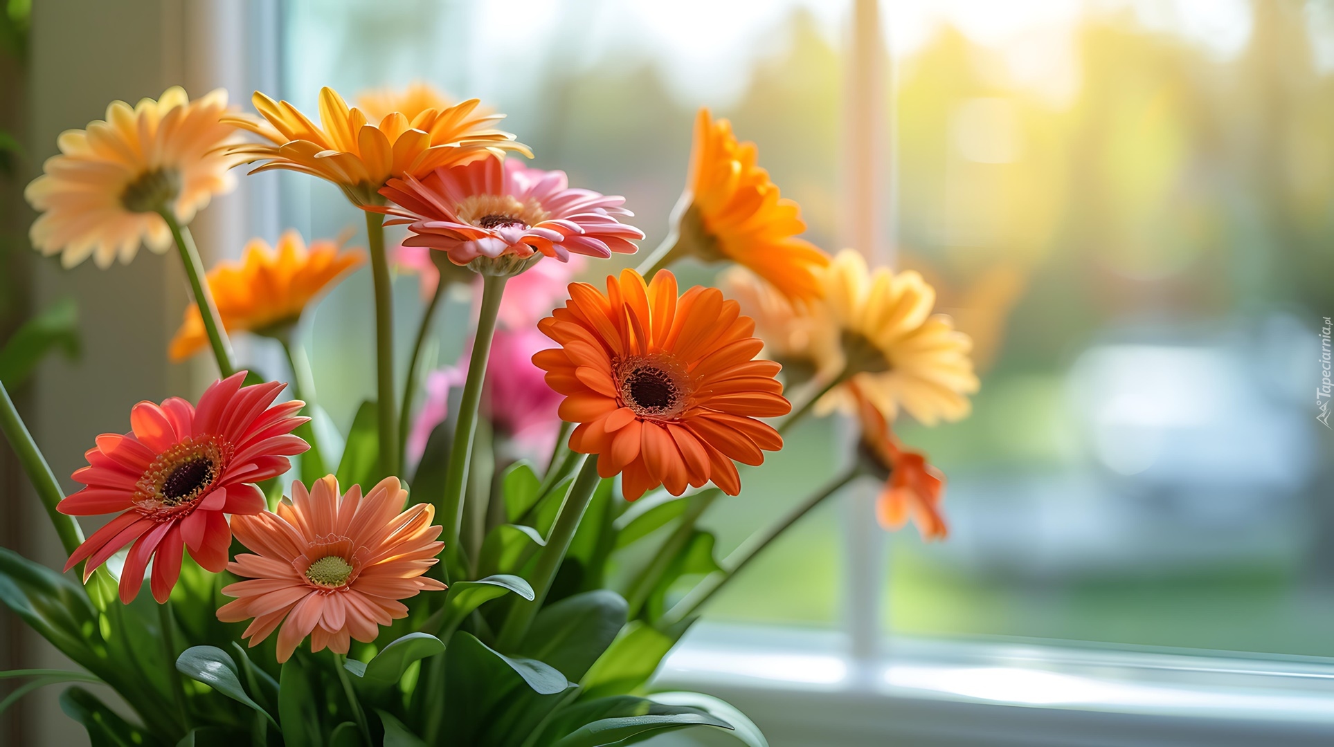 Edytor tapety: Kolorowe gerbery w bukiecie przy oknie