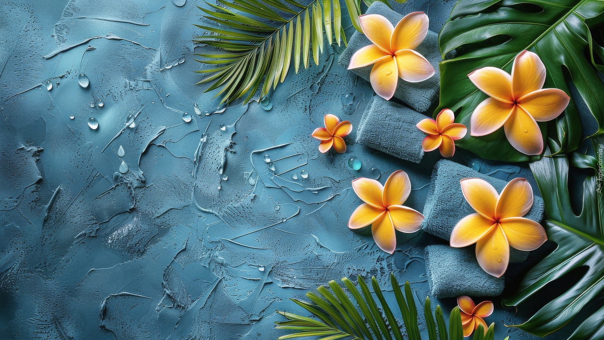 Edytor tapety: Plumerie na liściach i ręcznikach