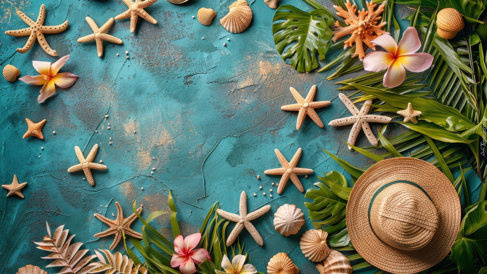 Edytor tapety: Kapelusz i rozgwiazdy z muszelkami na kolorowym tle