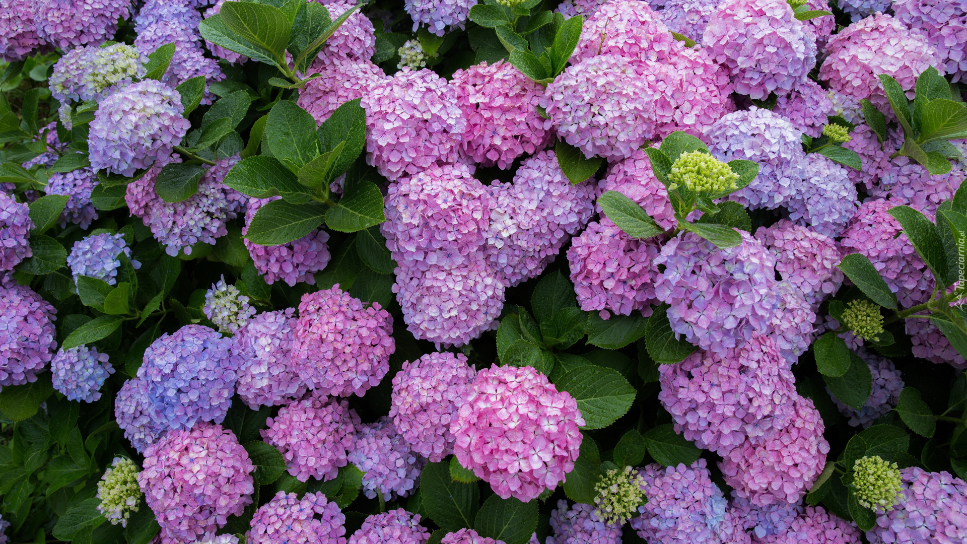 Edytor tapety: Rozkwitnięte kwiaty hortensji wśród liści