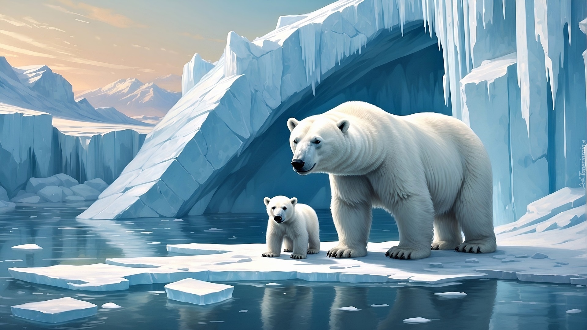 Edytor tapety: Dwa niedżwiedzie polarne obok góry lodowej