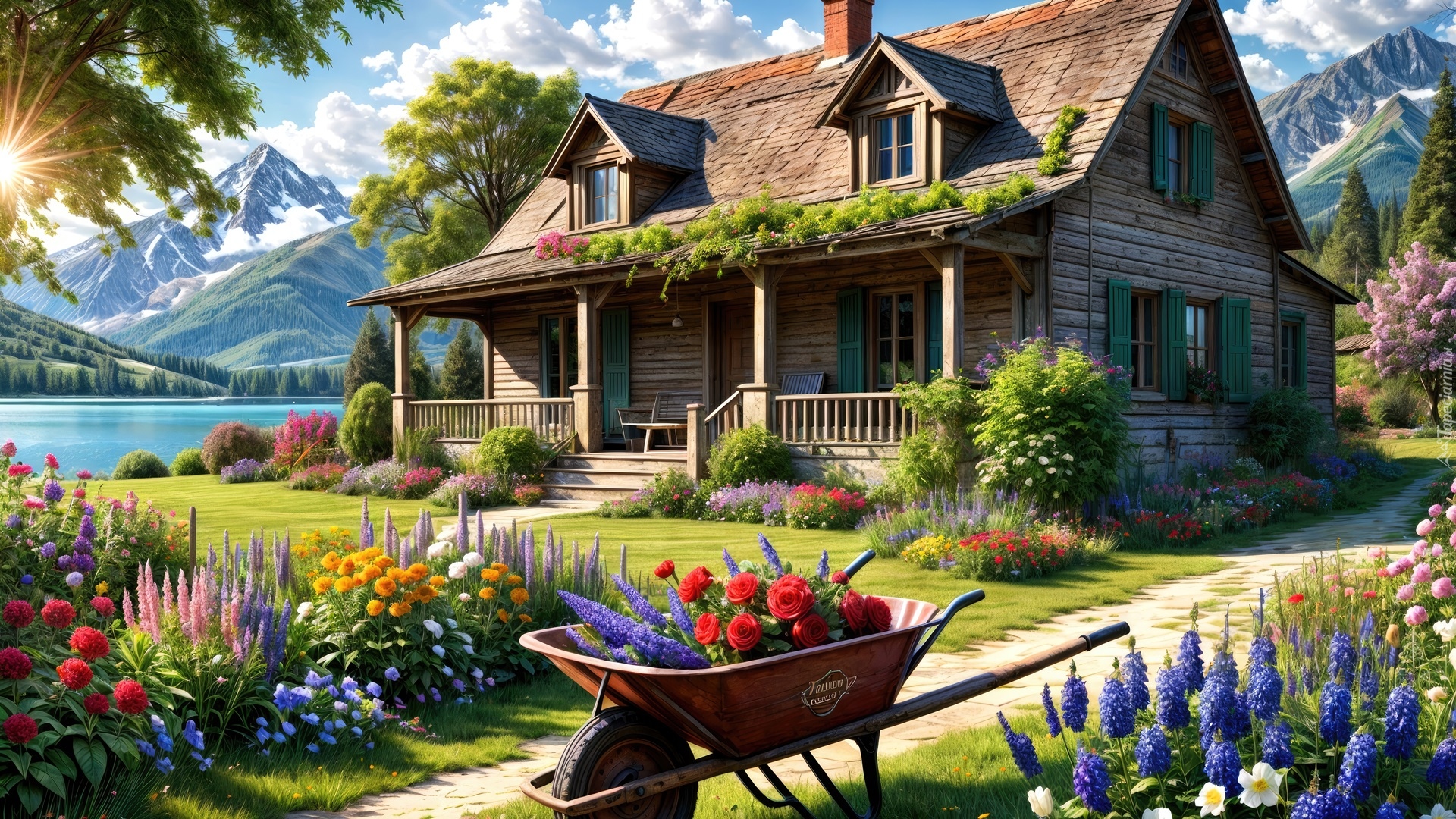 Edytor tapety: Drewniany dom i taczka w ogrodzie