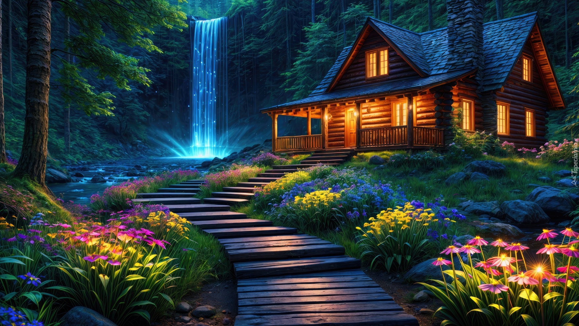 Edytor tapety: Oświetlony drewniany dom i wodospad