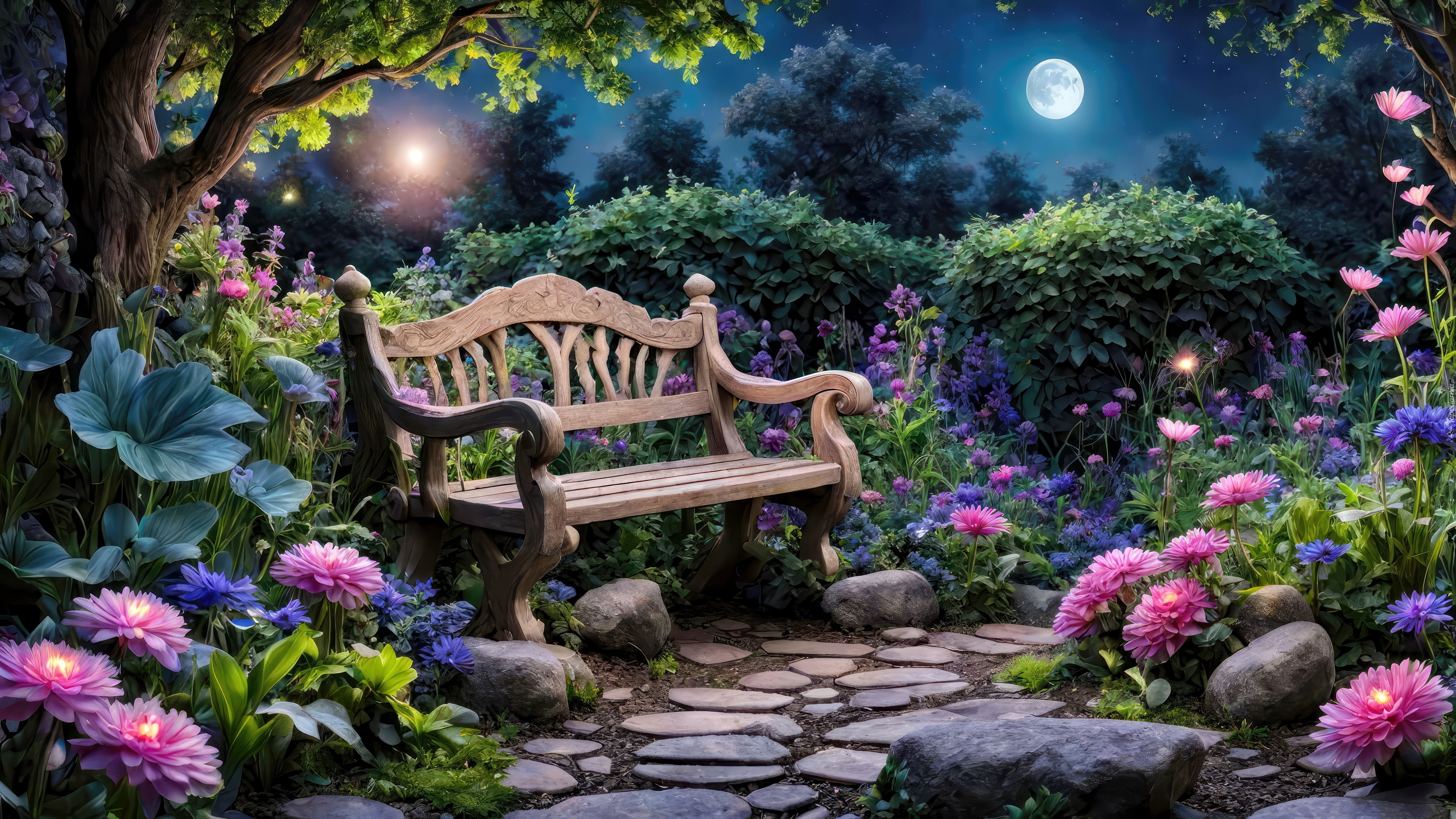 Edytor tapety: Ławka i ogród w blasku księżyca