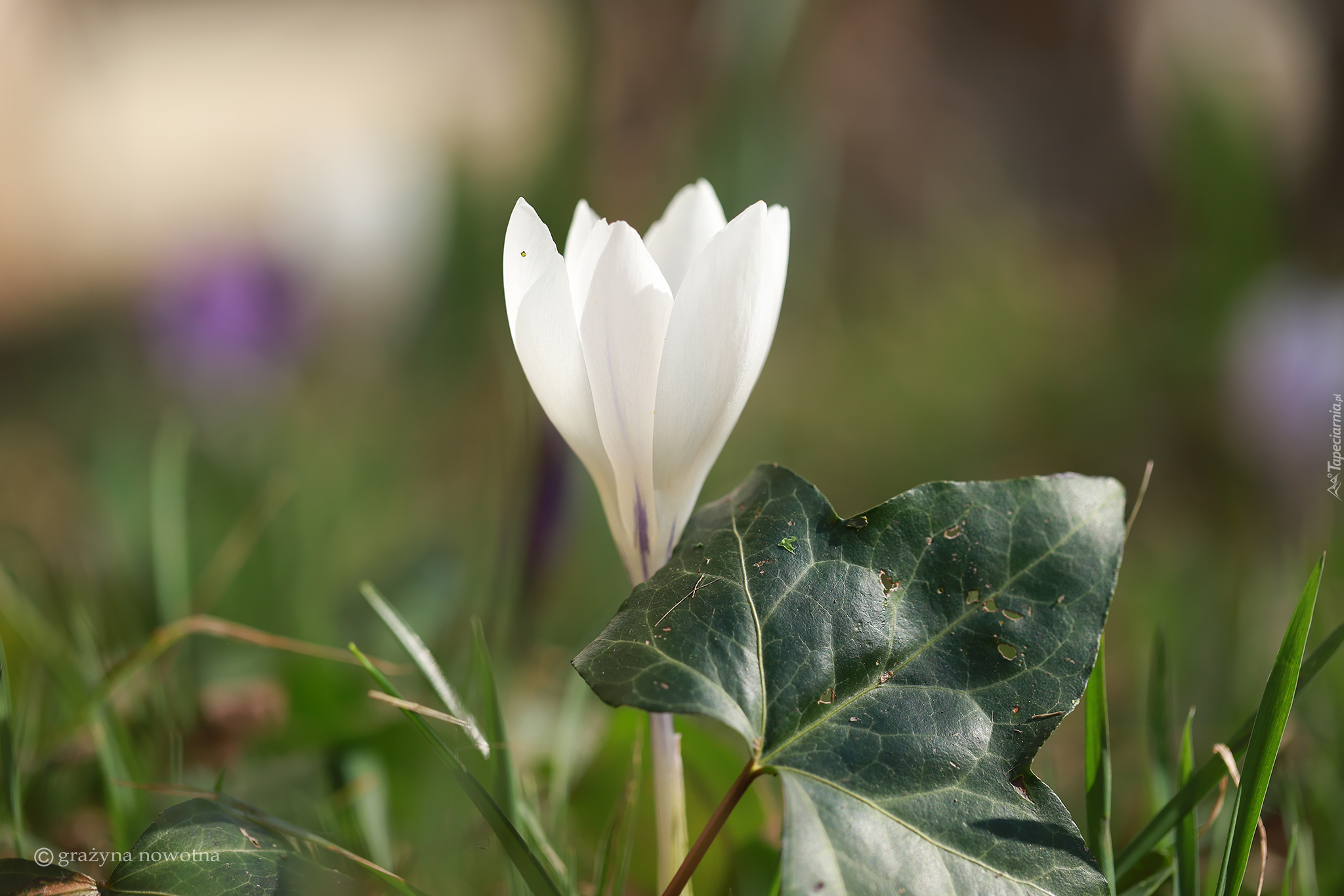 Edytor tapety: Biały krokus i liść na rozmytym tle
