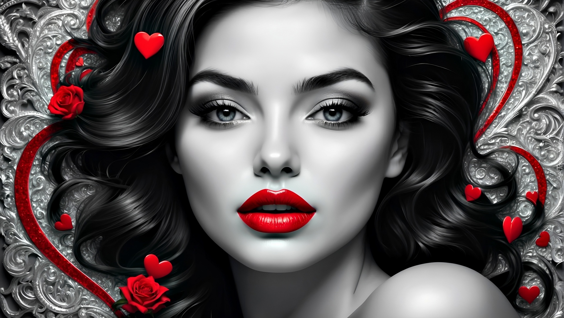 Edytor tapety: Twarz brunetki z czerwonymi ustami