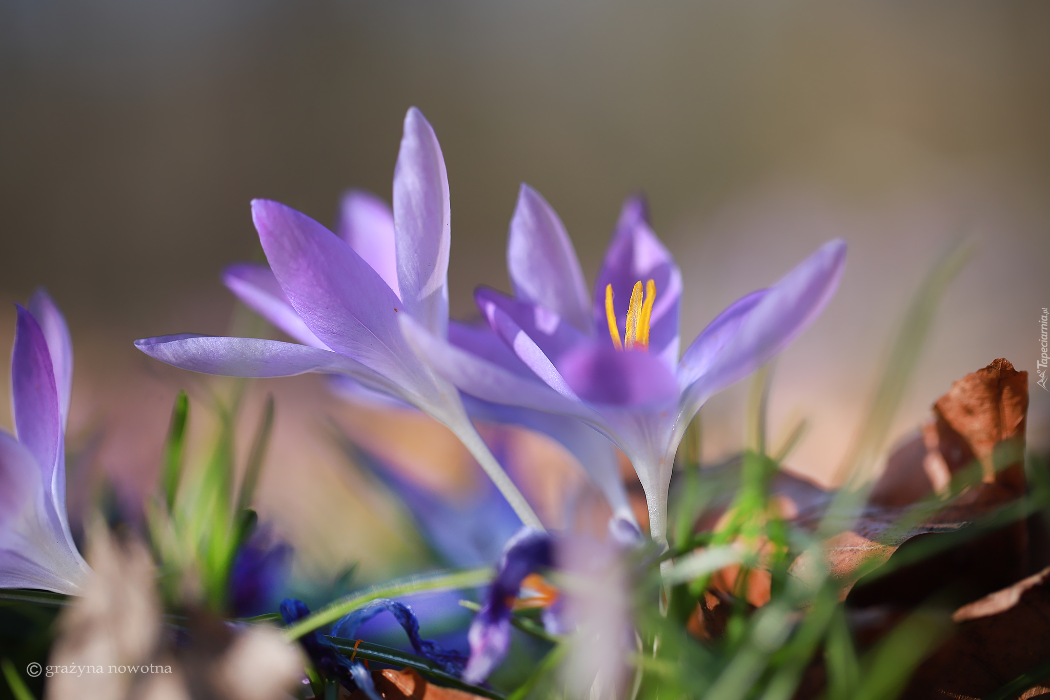 Edytor tapety: Dwa rozświetlone fioletowe krokusy na rozmytym tle